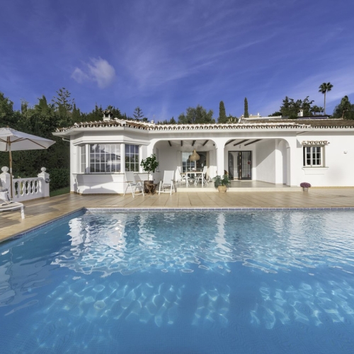 En af de bedst beliggende villaer på kysten i La Sierrezuela er nu kommet til salg. Enestående panoramaudsigt til havet, by, golfbaner og bjerge. Villaen som er i et plan ligger på en stor meget privat grund på 1260m2. Stor dobbeltgarage, pluds masser af parkeringsplads inden for porten. Dejlig stue/spisestue med udgang til den store delvist overdækkede terasse. Fint køkken i forbindelse med stuen og 3 rummelige soveværelser med hver sit tilhørende badeværelse + et gæstetoilet i entreen. Stor swimmingpool med udsigt til mijasbjerget. Skal opleves!