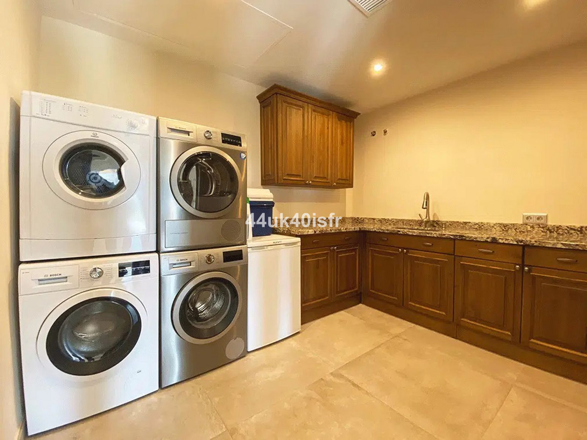 The heart of the home is a 162 m² open-plan living space combining kitchen, dining, and lounge areas centered around a wood-burning fireplace. Large sliding doors open onto an expansive terrace with multiple areas for relaxing, dining, and entertaining, all set against the spectacular backdrop of Mijas Golf.