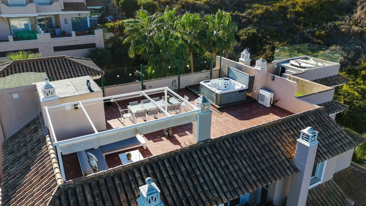 The open-plan living area flows effortlessly onto a private terrace, where panoramic views stretch across the landscape and beyond. An impressive solarium provides additional outdoor space — ideal for entertaining or unwinding — complete with an outdoor kitchen and jacuzzi for enjoying the warm Spanish evenings in total privacy. in addition you get to enjoy communal swimmingpools in plural and lush, wellkept gardens, throughout the urbanisation.