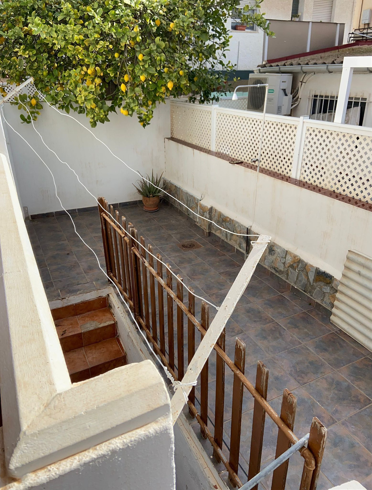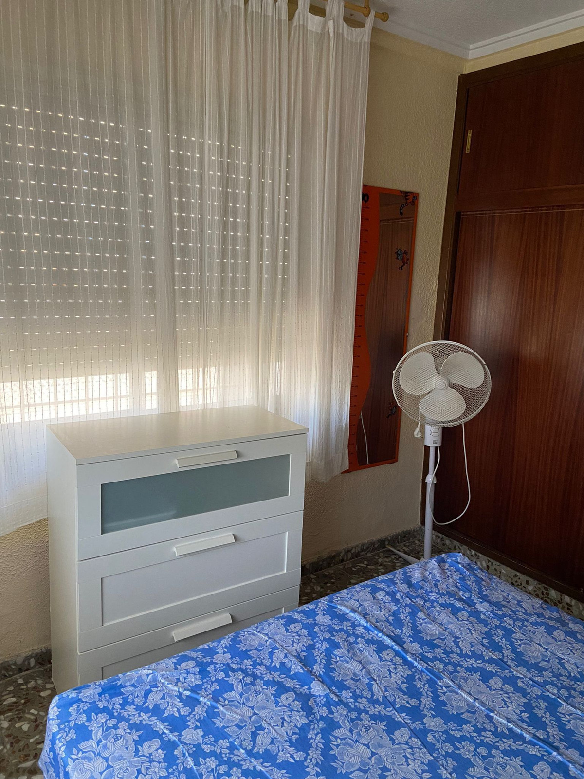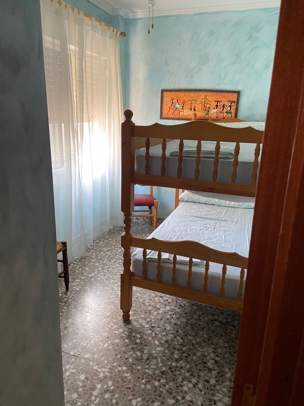 This accommodation has four bedrooms, one bathroom, living room and kitchen. There is also a large patio on the ground floor and a smaller patio that is used as a laundry room.