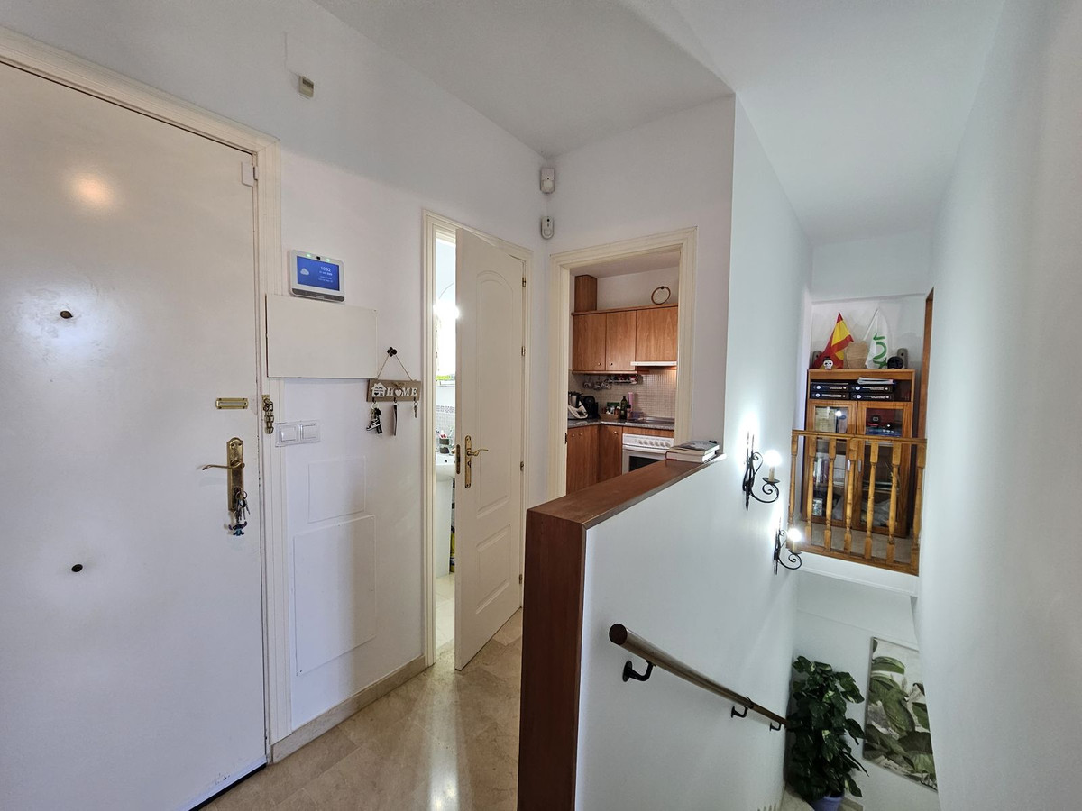 Selve boligområdet består kun af 42 ejendomme og er velholdt, med lave boliggebyrer på 60 euro om måneden, men med brug af en meget velholdt pool! Selve huset har meget at byde på. I stueetagen har du din egen private garage lige uden for døren, så din bil er altid dejlig kølig og slipper for at køre i regnvejr. I stueetagen er der 2 soveværelser i god størrelse med indbyggede skabe og eget badeværelse. Stort vaskerum og opbevaring. Værelserne er altid dejlige og kølige, men der er monteret persienner og aircondition i alle værelser og på terrasser! Første sal, gæstetoilet, separat køkken, stue/spisestue og en 20M2 sydvendt terrasse. Herfra er der en spiraltrappe til endnu en 30M2 privat terrasse med fantastisk udsigt, selv over havet!