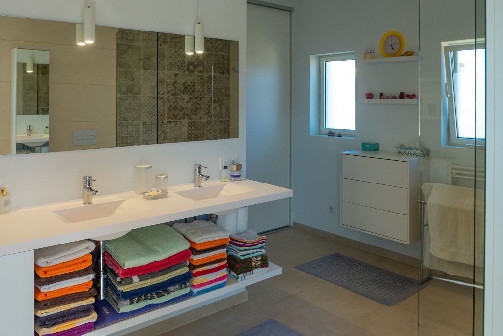 On the main level, you are welcomed by a bright entrance hall with a guest toilet and built-in wardrobe. The fully equipped modern kitchen, complete with top-quality appliances, opens to the dining area and a cozy living room with fireplace a warm and inviting space perfect for gatherings.From the living-dining room, large sliding doors lead directly to the covered porch and the terrace with swimming pool, creating a seamless indoor-outdoor living experience.This floor also includes three spacious bedrooms, each with its own en-suite bathroom and built-in wardrobes, ensuring both privacy and comfort.