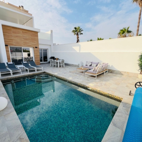 We present this Mediterranean-style villa located in El Algar (Murcia) , a unique property that combines space, privacy, and comfort in one of the most peaceful and residential areas of the Costa Cálida . With a plot of 4,280 m² and a constructed area of 430 m² , this nearly new villa offers everything necessary to enjoy a life of luxury and well-being.\n