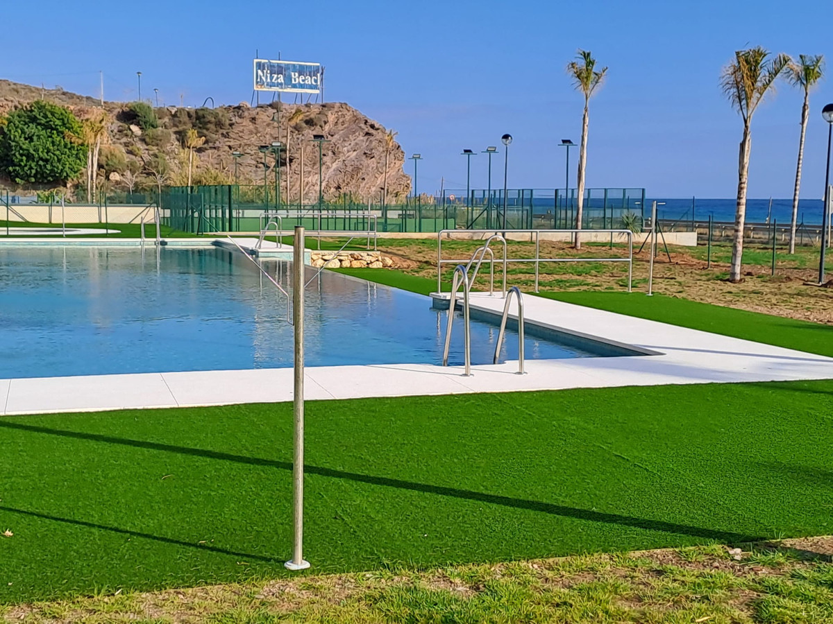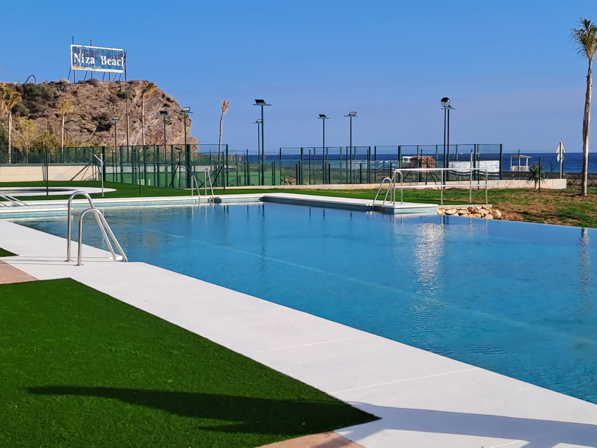 Stueetager med store terrasser, første og anden sal med terrasser. Privat område med haver, 2 swimmingpools og 2 padelbaner.