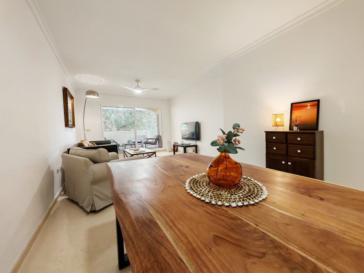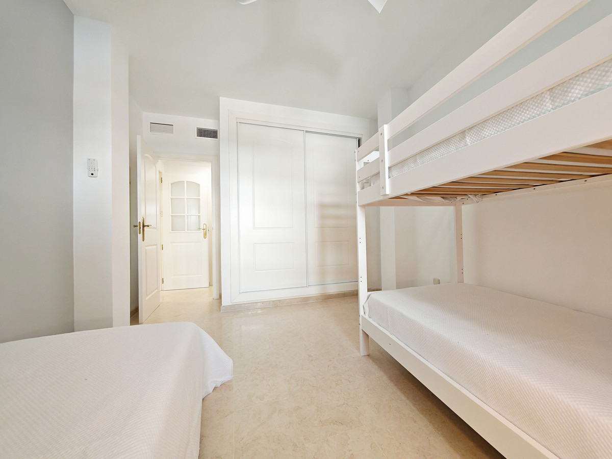 Apartment for sale in Elviria, Marbella with 2 bedrooms, 2 bathrooms, 1 on suite bathroom and with orientation south/west, with communal swimming pool, communal garage (1 parking spaces) and communal garden. Regarding property dimensions, it has 123 m² built and 16.25 m² terrace. Has the following facilities amenities near, air conditioning, fully furnished, fully fitted kitchen, marble floors, private terrace, kitchen equipped, water tank, country view, indoor pool, laundry room, internet - wi-fi, covered terrace, fitted wardrobes, gated community, lift, close to sea / beach, close to golf, balcony, excellent condition, ceiling cooling system, close to town, close to schools, surveillance cameras, inside golf resort and close to restaurants.