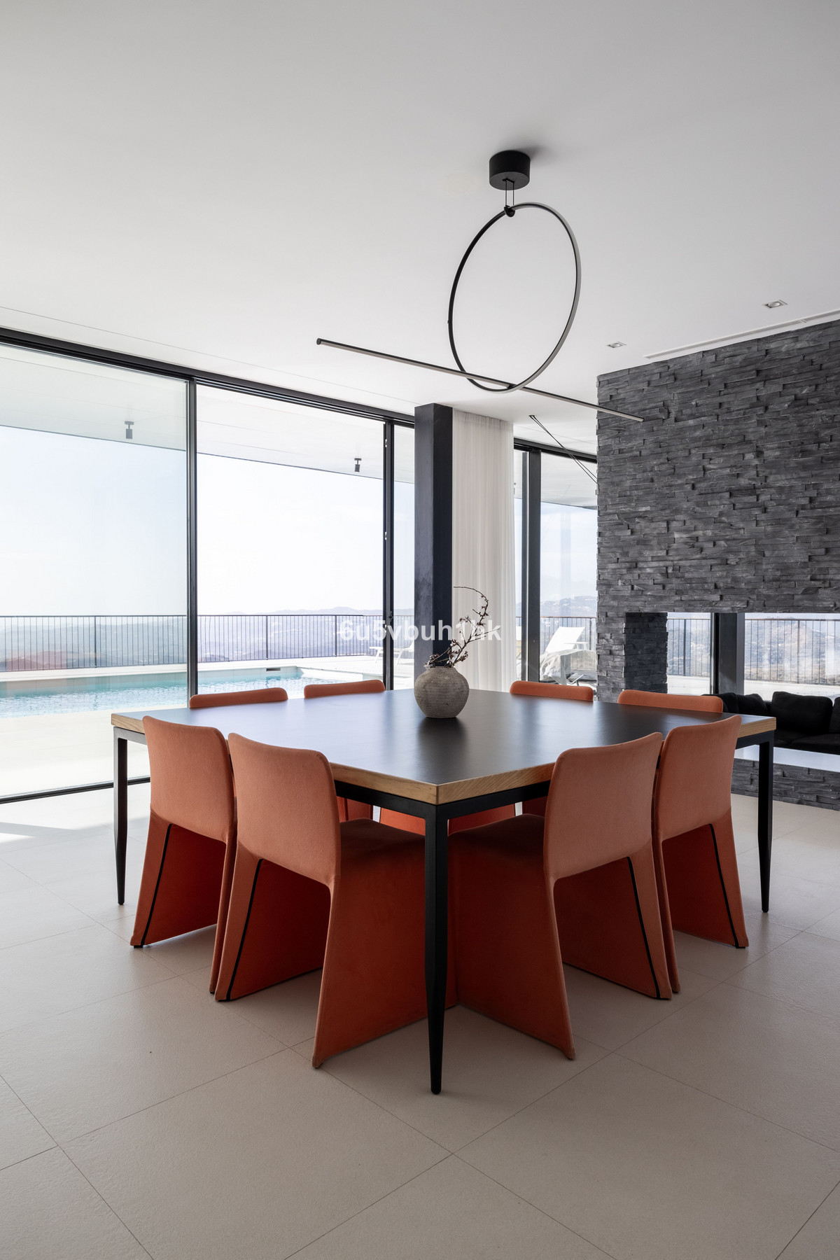 The villa boasts a total built area of 916m², providing an great deal of space both indoor and outdoor. The interior of the property is meticulously designed with high-quality finishes and attention to detail. The open-plan layout of the living areas creates a seamless flow between the kitchen, dining area, and lounge, perfect for entertaining guests. The gym, cinema room and service areas are located on the lower level as well as the outside exterior foyer. Entering the center of the house via the large wooden staircase, you will immediately feel the grand atmosphere. In the living room theres is plenty of space for a lot of cozy evenings in the custom made sofa in front of the big fireplace. Every piece of furniture, light and art is carefully chosen to create a warm feeling from the honey tones of oak, to the big sliding glass doors that at the same time gives you the feeling of indulging in the nature.