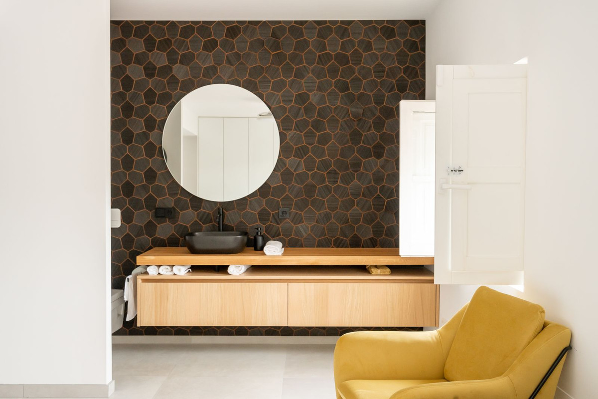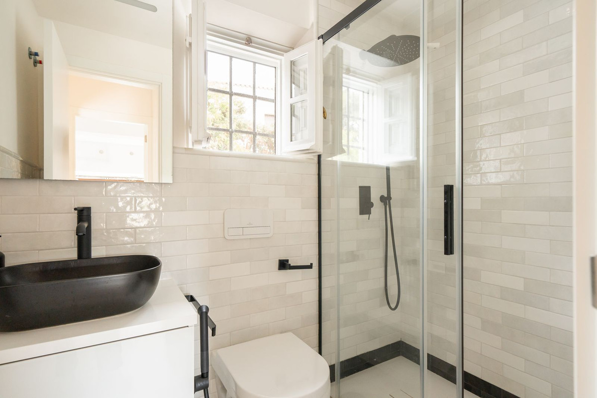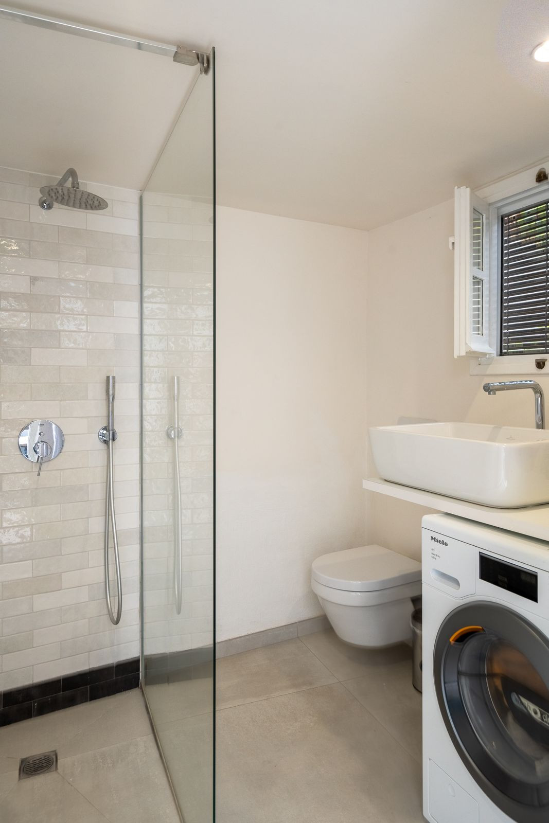 Upstairs, two serene bedrooms provide a peaceful retreat, with the primary suite overlooking lush communal gardens. High-end finishes include Marazzi Italian tiles, Treemme fixtures, Villeroy & Boch appliances, and porcelain flooring throughout. Underfloor heating ensures comfort year-round.
