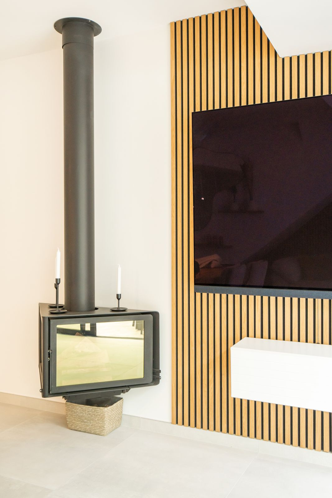 The main floor features an open-plan living and dining area, a stylish white kitchen, and a statement iron-and-glass fireplace. Large glass doors open onto a sunny private patio — ideal for dining or relaxing outdoors. An adjacent outbuilding houses a laundry area, toilet and shower, designed for both functionality and style.