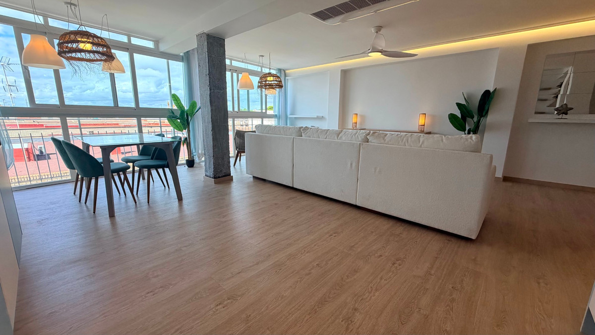 This Reformed, Three Bedroom, Fourth Floor Apartment in Lo Pagan, is located just 100 metres from a lovely stretch of beach, in an area well known for its natural mud baths and only a 5 minute walk to the marina, with a great variety of café bars and eating places on the doorstep. Positioned on the borders of Santiago de la Ribera and San Pedro del Pinatar, this superb location also offers easy access to San Javier and the popular Dos Mares shopping centre, just a short drive away. Beautifully renovated by an interior designer in 2025, the apartment boasts a stylish open plan living space with air conditioning and wall-to-wall glazed windows, filling the room with natural light. The modern, open plan fitted kitchen includes a utility area, and the layout features three double bedrooms with built-in wardrobes. The master bedroom enjoys a view to the sea and also benefits from an en suite shower room and a walk-in wardrobe, while a contemporary family shower room completes the interior. The building is serviced by a lift and has access to a municipal pool nearby.\n