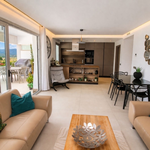 Denne moderne hjørnelejlighed med have til salg tilbyder næsten idyllisk moderne luksusliv og giver følelsen af at bo i en nybygget villa i ét plan. Byggeri af høj kvalitet med moderne åben planløsning og smukt dekoreret overalt. Entré med luksustapet og træpaneler i dele, der fører til det primære opholdsområde og alle soveværelser og badeværelser.