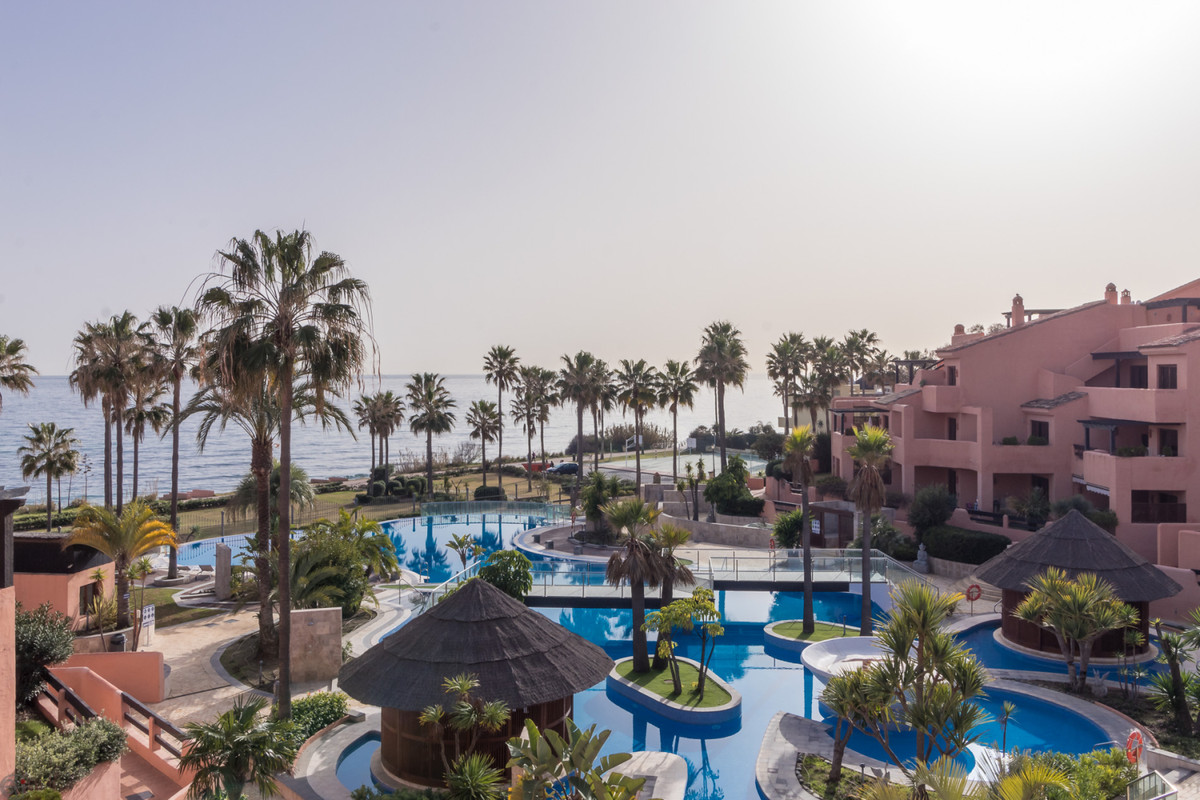 This beautiful and comfortable 3-bedroom, 2-bathroom property is located in one of Estepona's most exclusive frontline beach developments. The spacious living/dining area with open plan klitchen and the main bedroom both offer direct access to the terrace, which connects to the private garden, creating a seamless indoor–outdoor living experience. The purchase price includes a private underground parking space and a storage room.