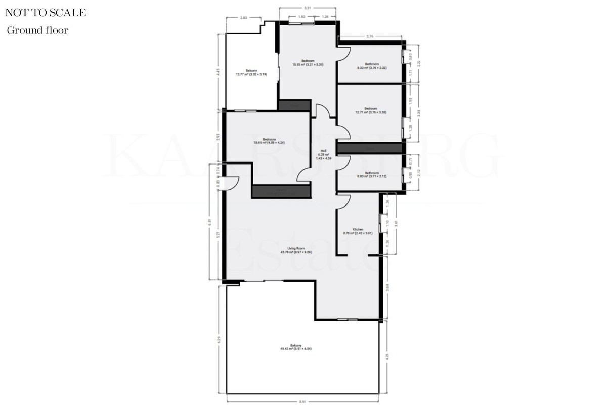 Den er på 144 m² og har i alt 52 m² terrasser fordelt på to områder: den forreste terrasse har imponerende havudsigt, mens terrassen på bagsiden vender direkte mod bjergene og er fuldt overdækket, så den kan bruges året rundt. En del af den forreste terrasse er også overdækket.