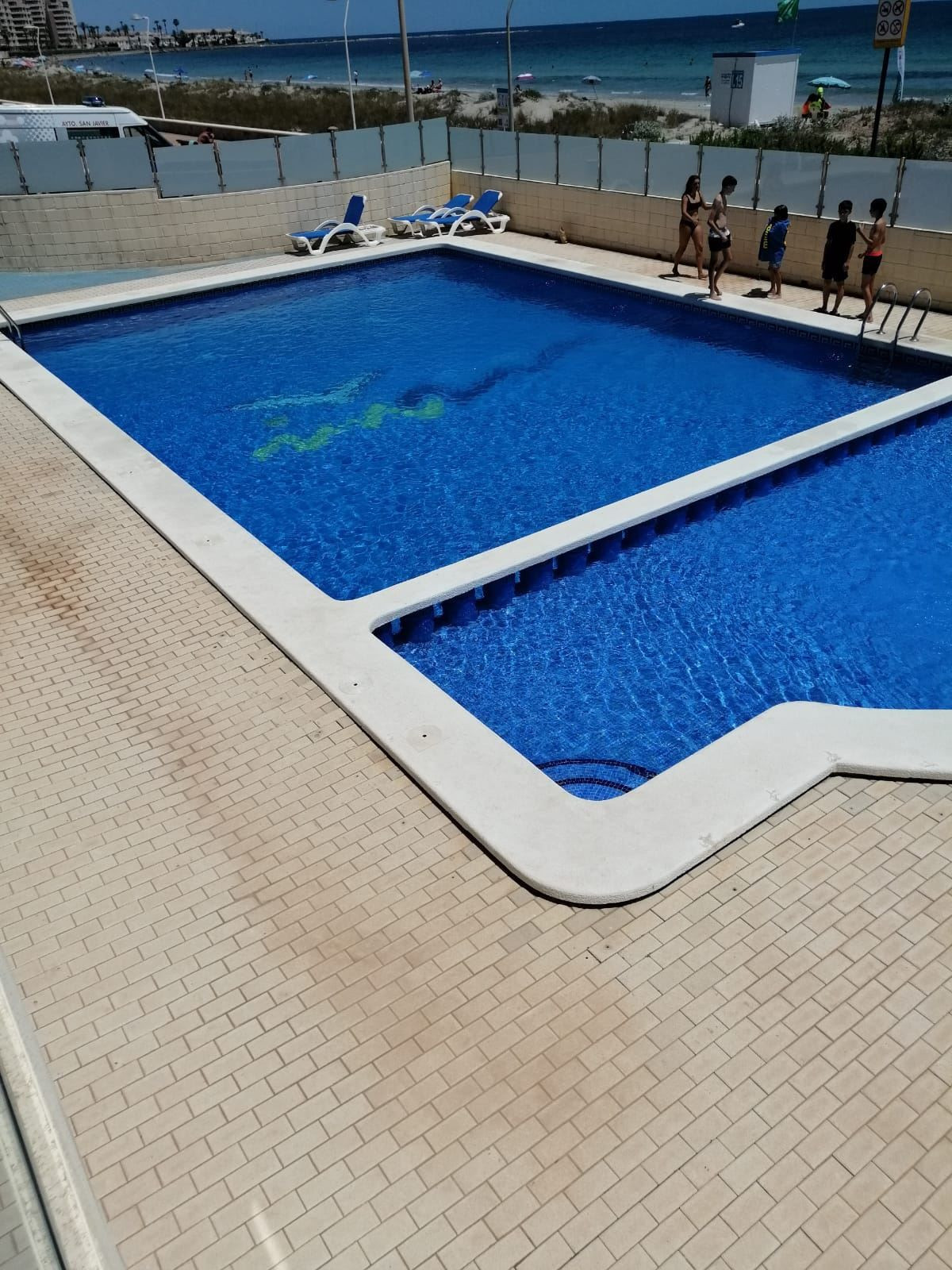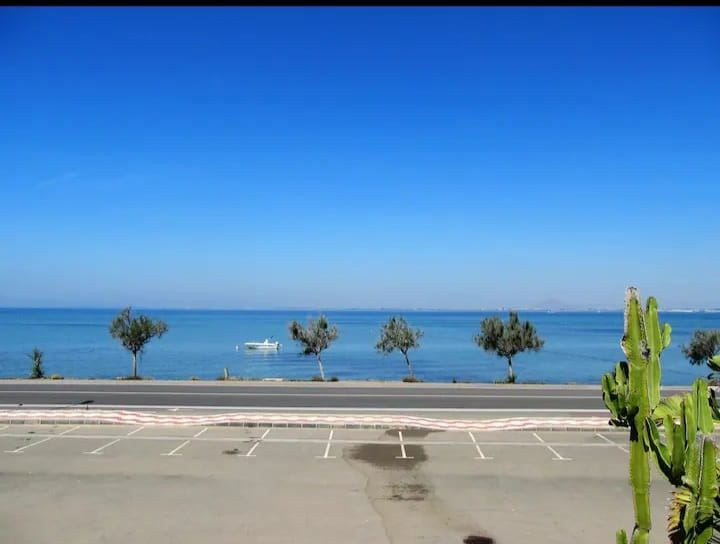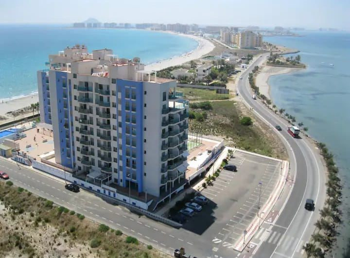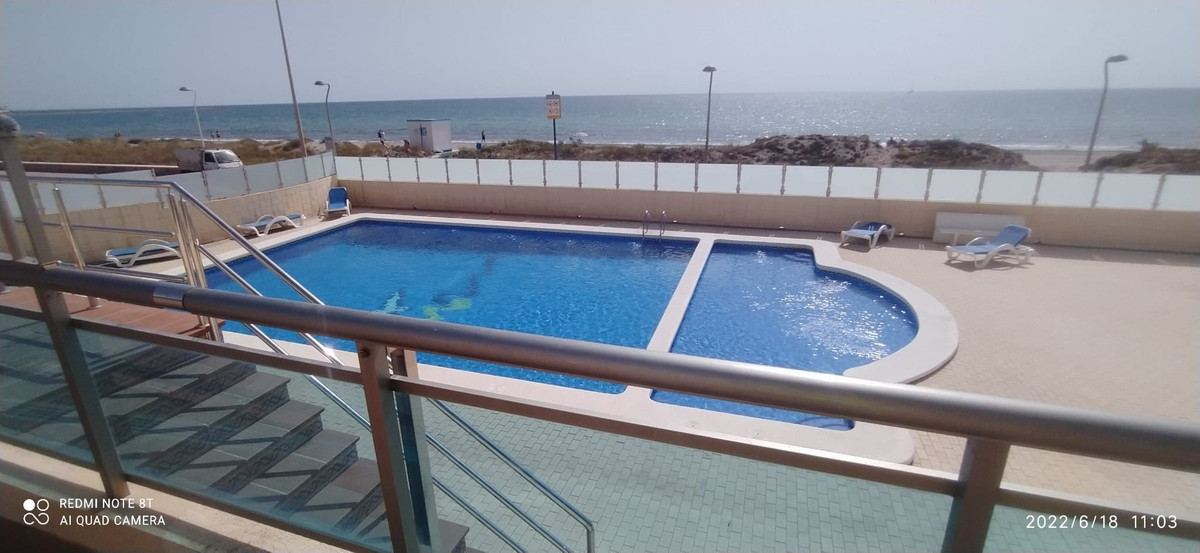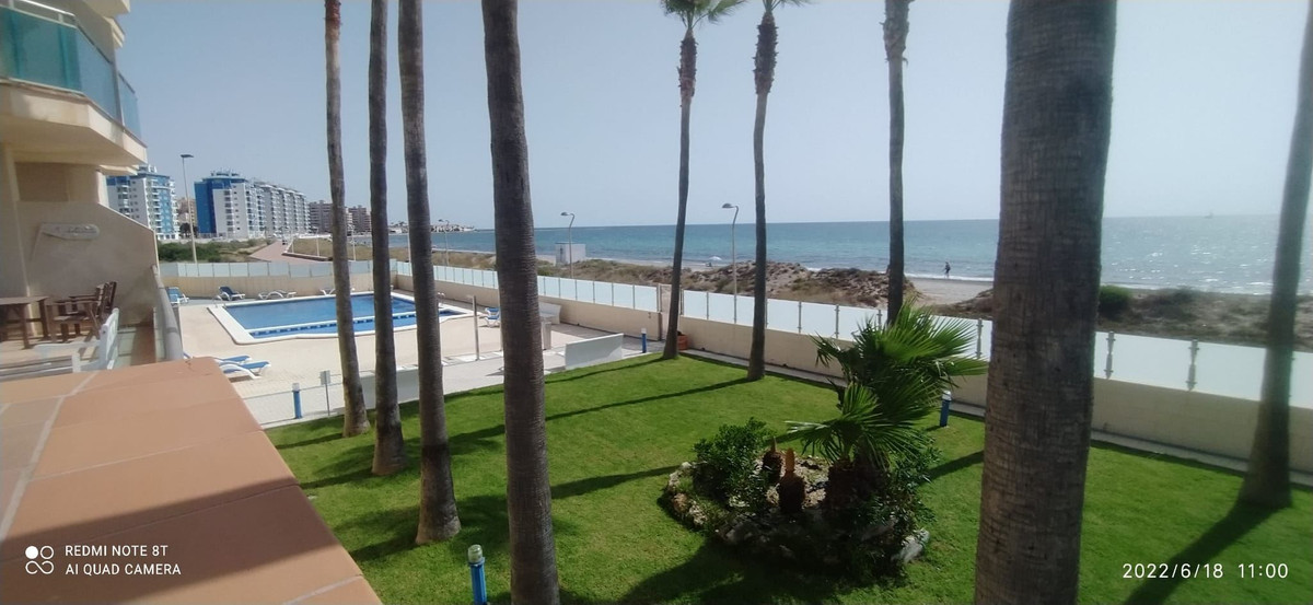 Modern and beachfront apartment with large terrace and shared pool A warm welcome to this charming and homely ground floor apartment with an inviting feel and generous light flow located in attractive La Manga. Here you live with views of Playa Veneziola, the Mar Menor and the mountains, as well as being close to shops and restaurants.