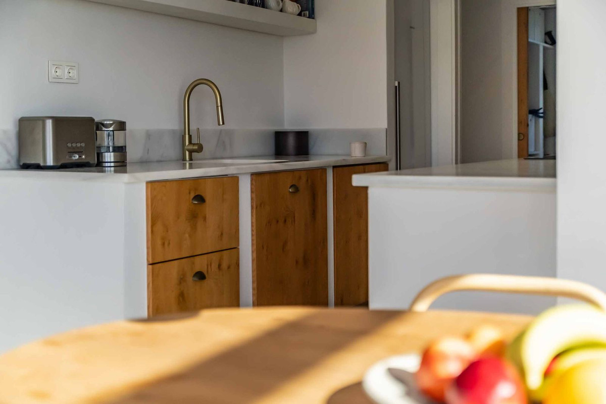 Hovedhuset byder på et lyst og indbydende opholdsrum med store vinduespartier, hvor lyset strømmer ind, og hvor der er direkte udgang til den rummelige terrasse med panoramaudsigt over Middelhavet. Det moderne, fuldt udstyrede køkken er både elegant og funktionelt og inviterer til madlavning, samvær og hyggelige stunder.