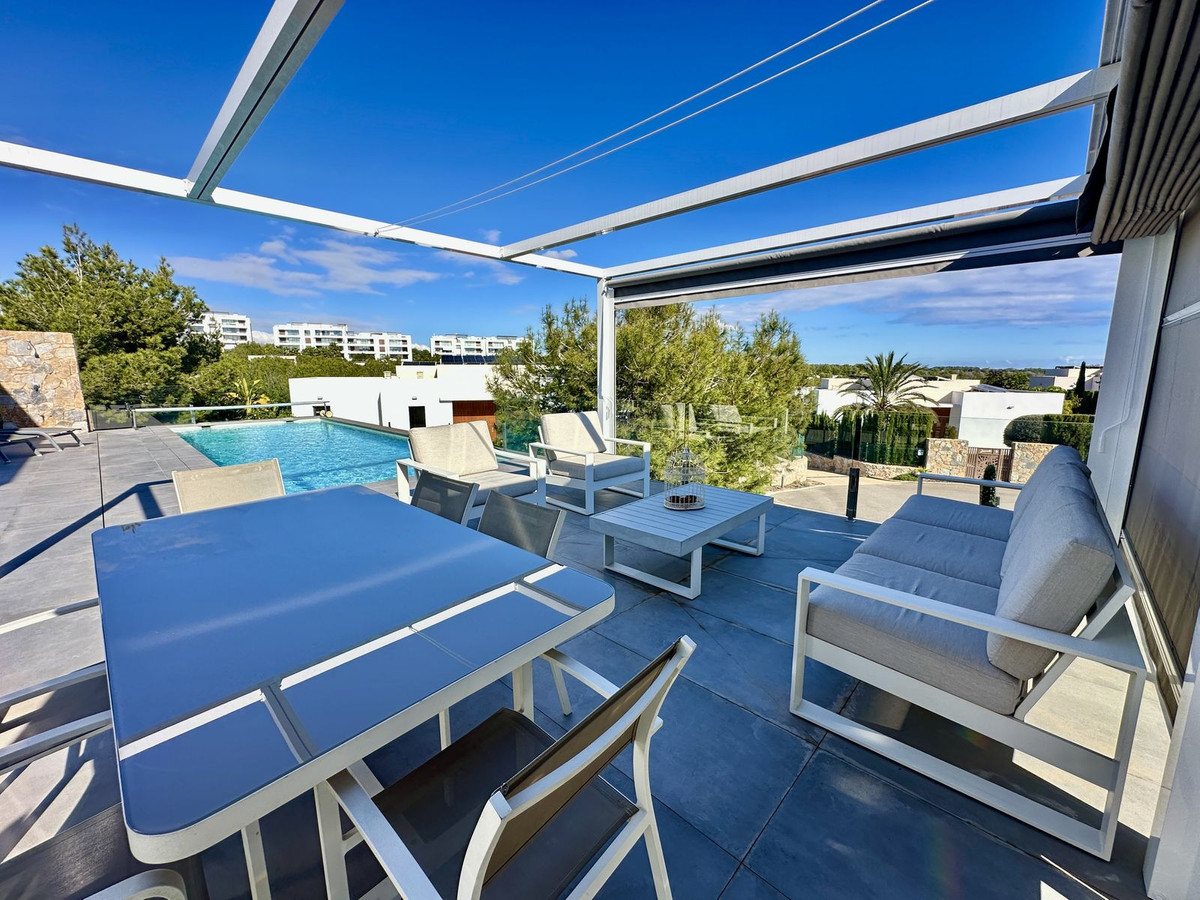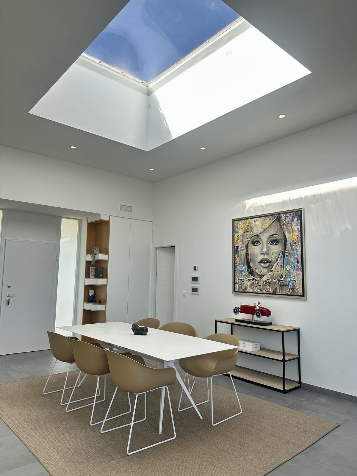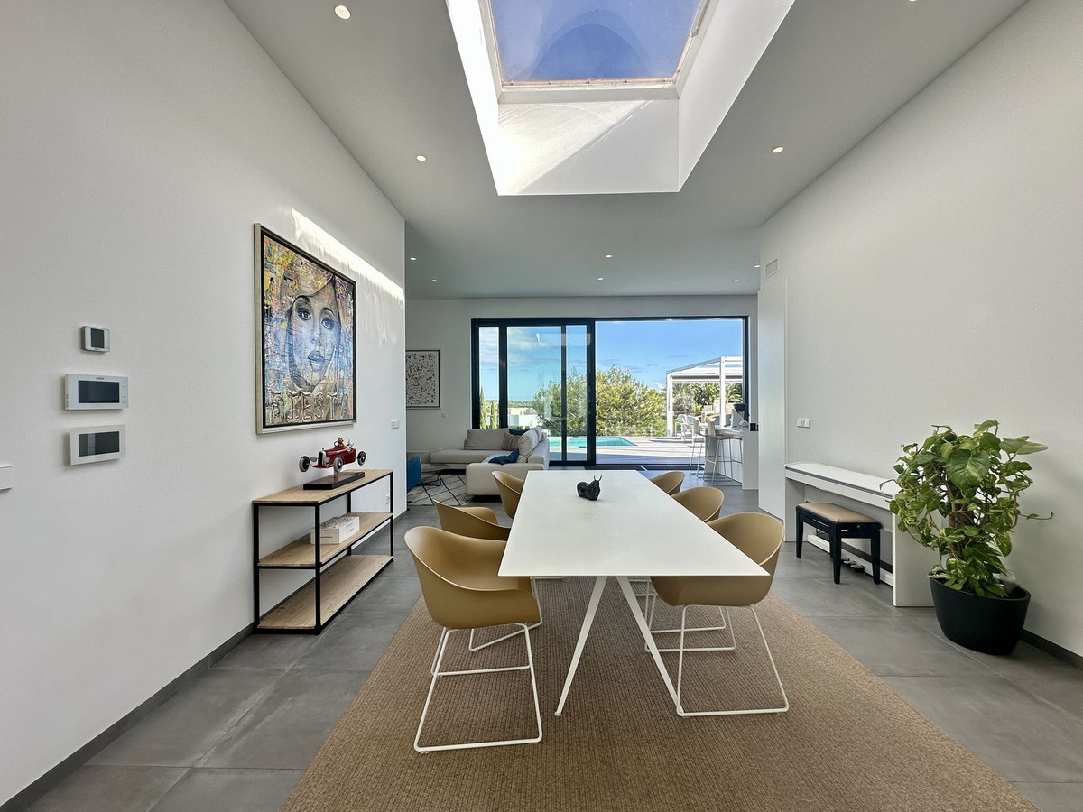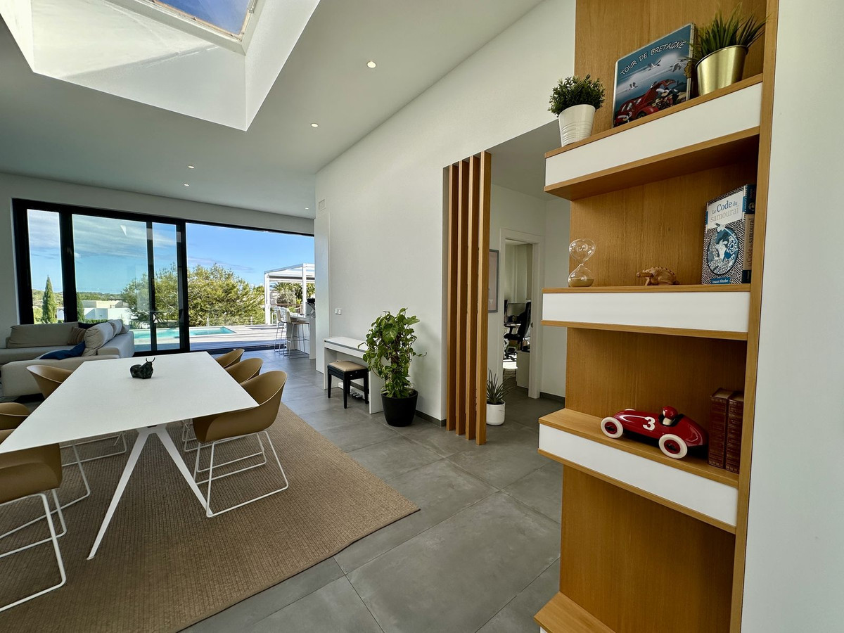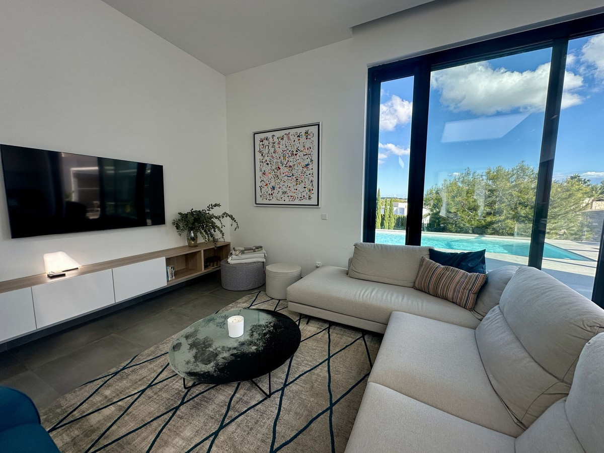 Step inside to be welcomed by soaring ceilings and an abundance of natural light. A striking picture window seamlessly blends the interior living space with an expansive 87 m² south-facing terrace, showcasing a 10-meter heated saltwater pool with tranquil views over the pine trees.