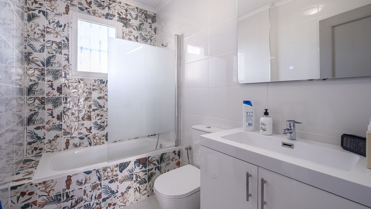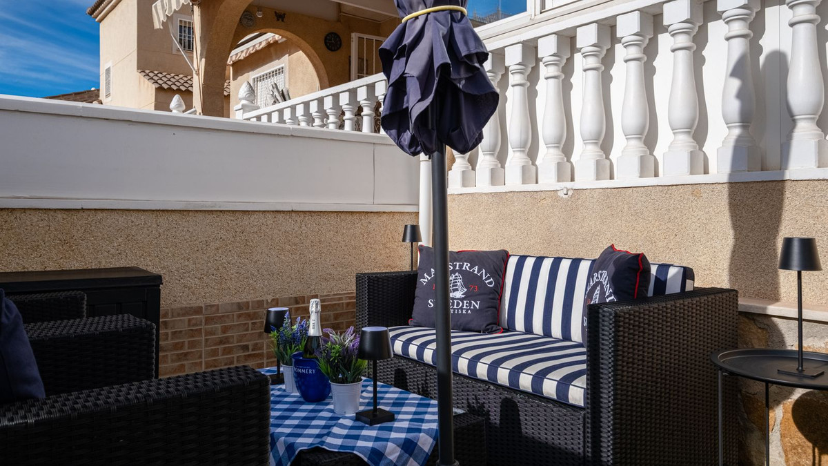 This home truly embraces the Spanish climate, offering several outdoor spaces perfect for relaxation and socialising. The glazed terrace becomes an extra room where your morning coffee, dinner or evening drink tastes just a little better. The low-maintenance garden runs along both the front and side of the house, and next to the terrace there is a balcony with a lovely view. At the very top, the private rooftop terrace awaits – a generous oasis with plenty of space for sun loungers, lounge furniture, a barbecue and long sunny days.