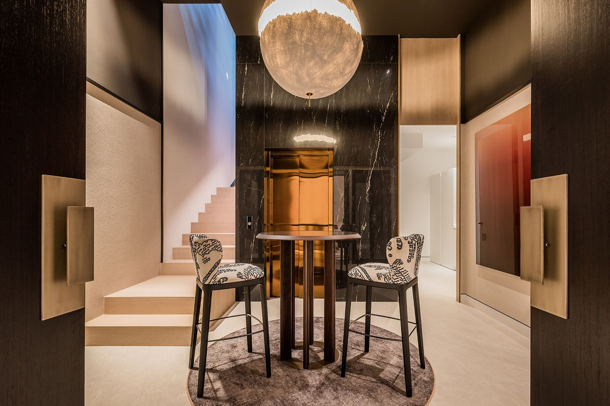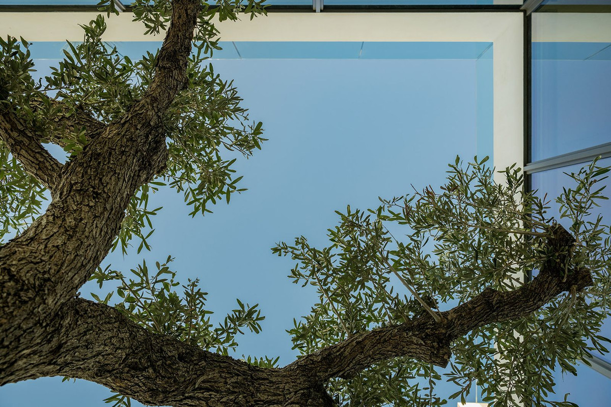 This villa spans four meticulously designed floors, connected by a private elevator. The spacious living area features a dramatic double-height ceiling, creating an airy, open atmosphere ideal for entertaining. This flows seamlessly onto a beautifully crafted terrace, perfect for embracing the indoor/outdoor lifestyle. The interior patio, complete with a mature olive tree, further enhances the villa's expansive feel, blending nature and design. The state-of-the-art Gaggenau kitchen is a chef's dream, equipped with top-of-the-line appliances, combining style with practicality.