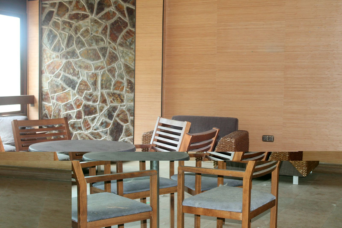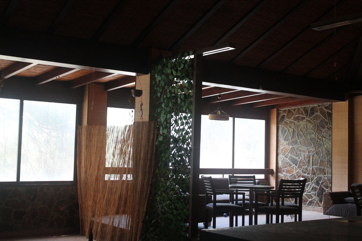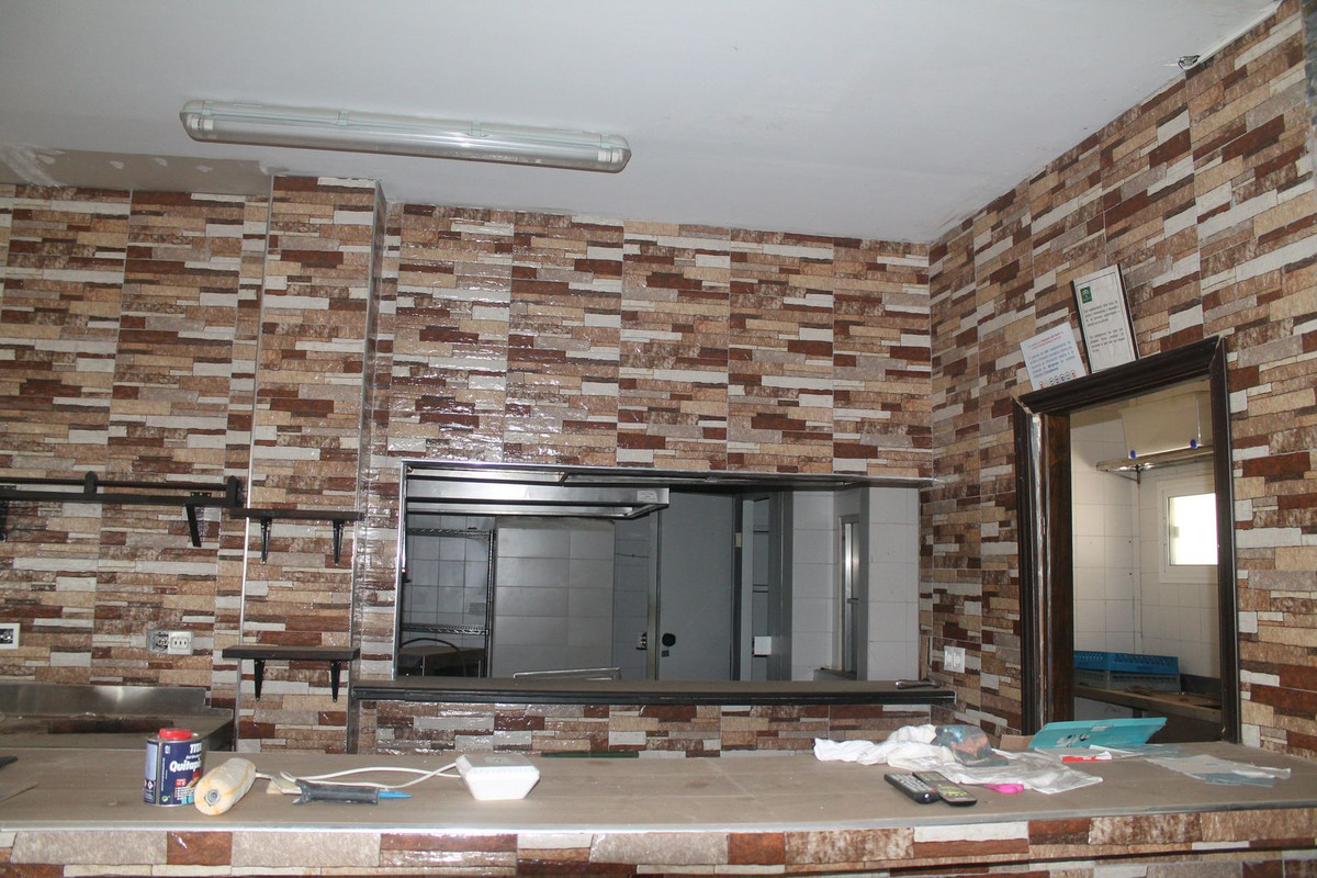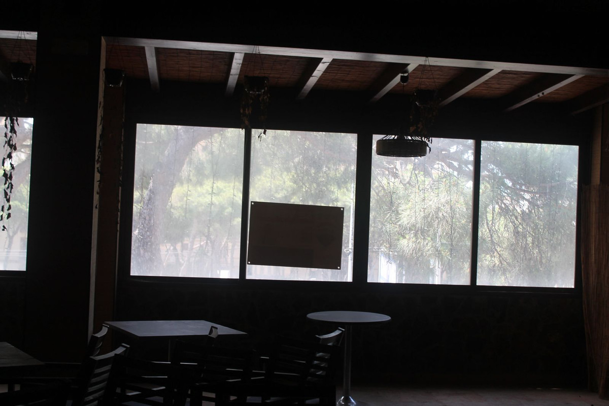 Upstairs, there is another bar, a small fountain, a changing area, a large bar, a kitchenette, and a food elevator. Large windows overlook the street and the A7 highway. It has two exhaust vents, an area for a barbecue, a gas water heater, and an area outside the restaurant for gas cylinders.