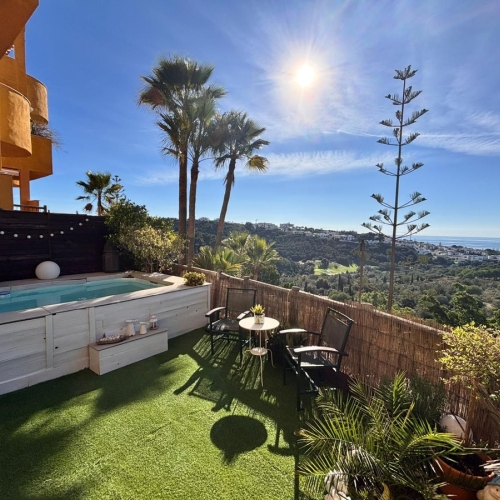 Fantastic apartment in Elviria-Marbella located on the golf course front line with open views and no buildings in front of you to block the view. The property is located in the gated complex El Mirador de Santa María Golf, surrounded by well-kept gardens and several swimming pools. The property has two bedrooms with built-in wardrobes, two full bathrooms, one of which is en-suite, a large, bright living-dining room with large windows, a separate fitted and equipped kitchen and a covered, sunny terrace. Parking space and storage room included. Very close to all amenities, such as supermarkets, banks, restaurants, pharmacies and the best beaches in Marbella. Just 35 minutes from Malaga International Airport. The property has potential, as it could be converted into a three-bedroom apartment, as some neighbours have done. Great opportunity. Come and visit! DS1