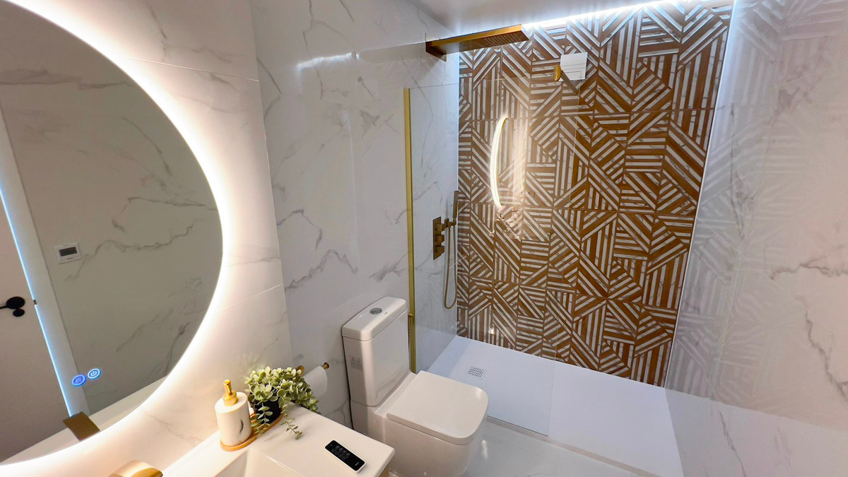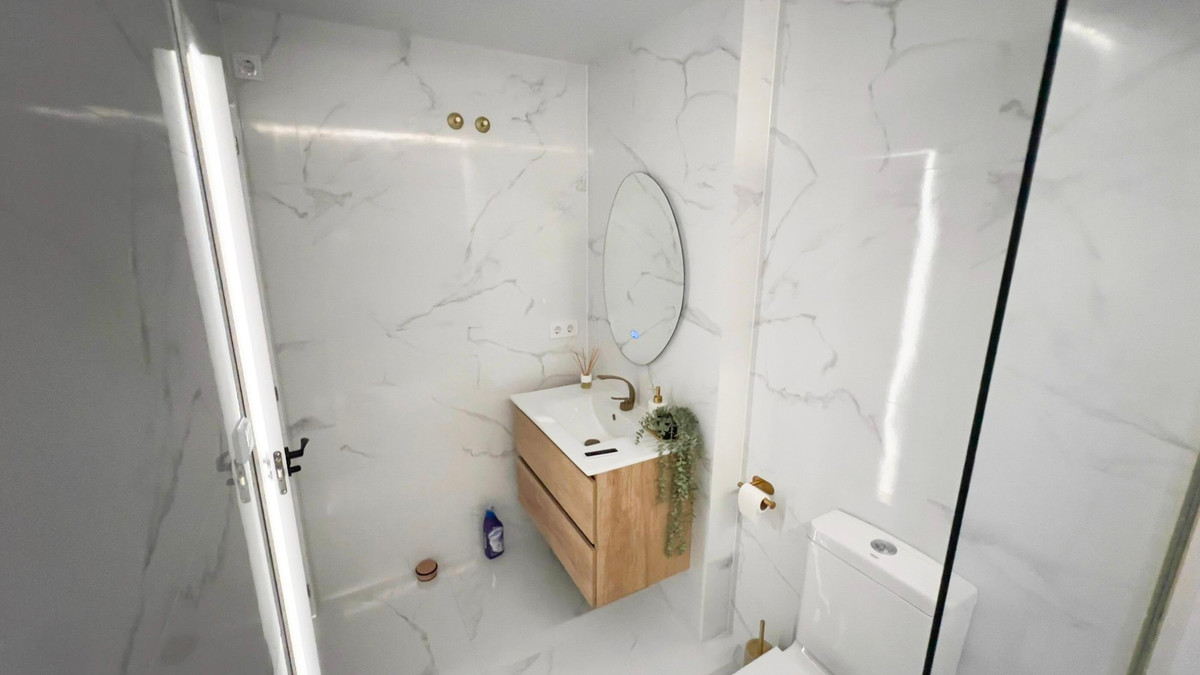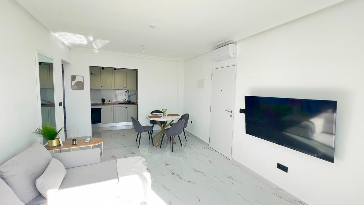 Discover this elegant, fully renovated townhouse in Residencial Zeniamar I , located in a prime location in Orihuela Costa . With 1 bedroom , 1 bathroom , 52 m² of interior space and 6.5 m² of terrace , this property offers a modern and bright design with direct sea views . The property is located on the first floor with a separate entrance and has fitted wardrobes , an open kitchen equipped with LG and Samsung appliances , inverter air conditioning , underfloor heating , a washer-dryer , a 55" smart TV , smoke sensors and Wi-Fi video surveillance , ensuring comfort and security.\n