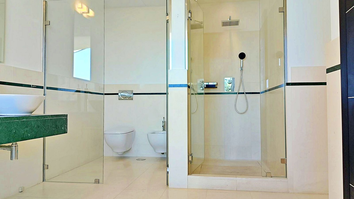 On the first floor, the master suite boasts stunning vistas of the sea and Gibraltar, complemented by a luxurious bathroom featuring a Jacuzzi, shower, and dual vanities. Two additional bedrooms, each with en-suite bathrooms, complete this level.