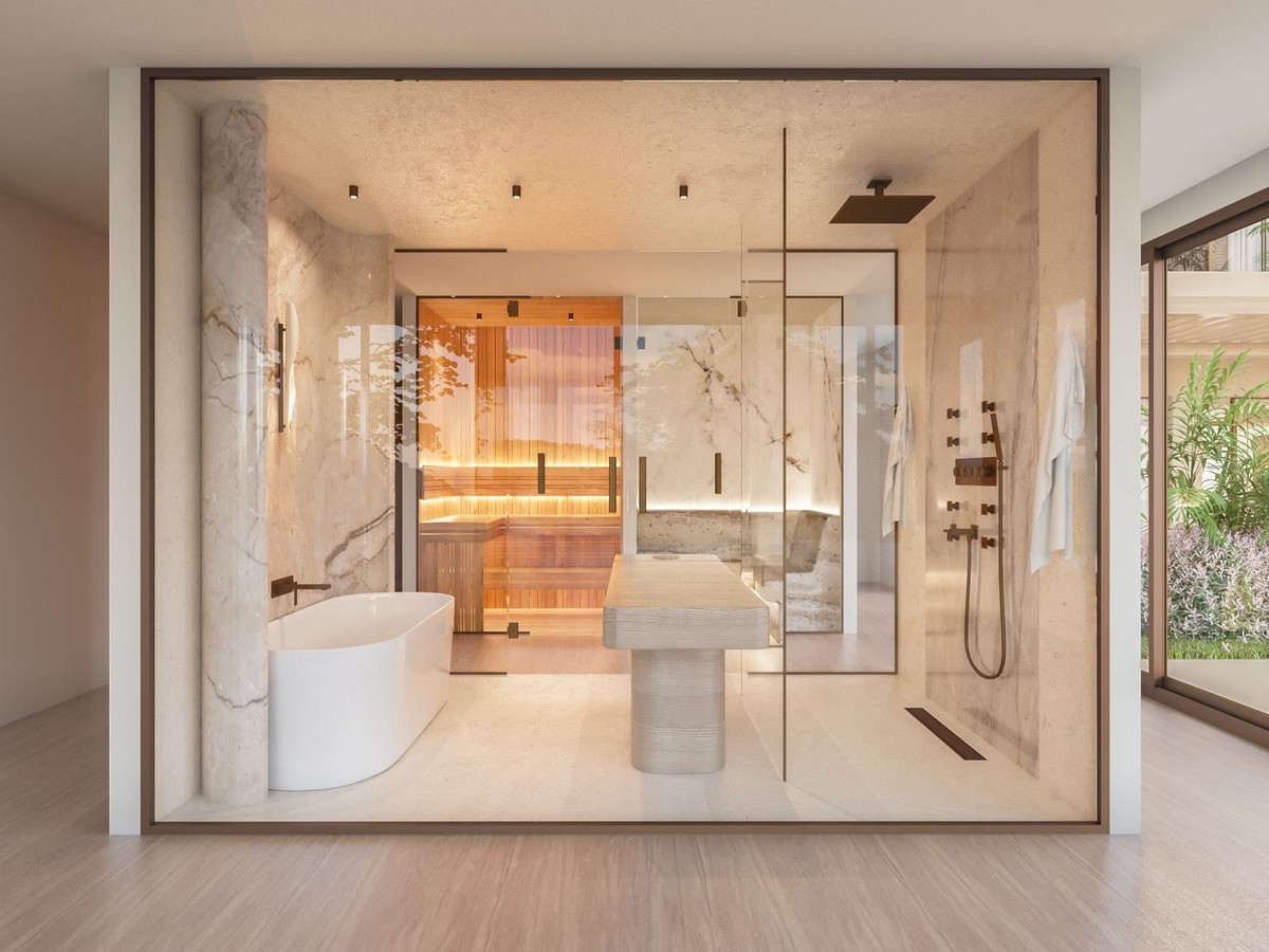 A 5-star hotel-level master suite with integrated spa, designer dressing room and bathtub next to the window.