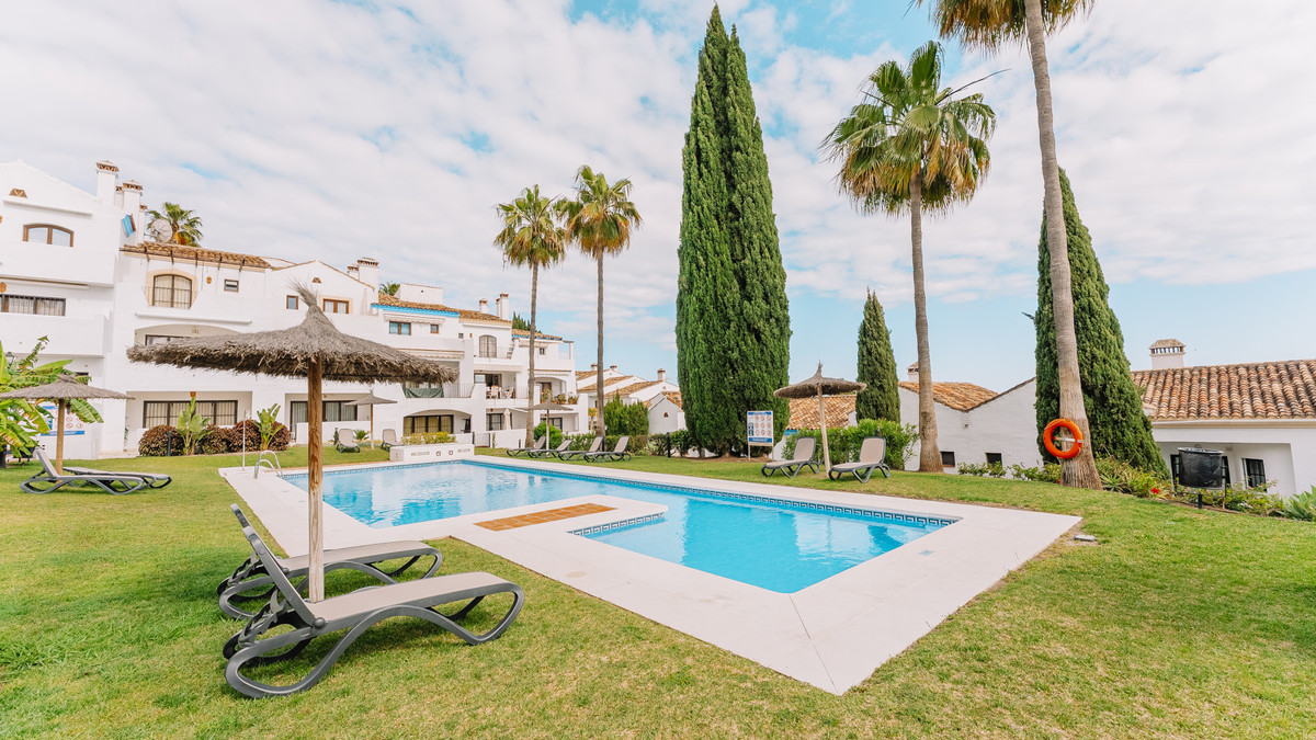 Located in El Alto within Los Arqueros, the townhouse occupies an elevated hillside position inside a gated residential urbanisation. The community is defined by landscaped gardens and two communal swimming pools, one oriented towards panoramic sea views. The property benefits from a south-facing terrace with open views across the Marbella and Estepona coastline extending towards Gibraltar, with protected surrounding land preserving the outlook. An upper terrace incorporates a private jacuzzi, reinforcing the multi-level exterior configuration.