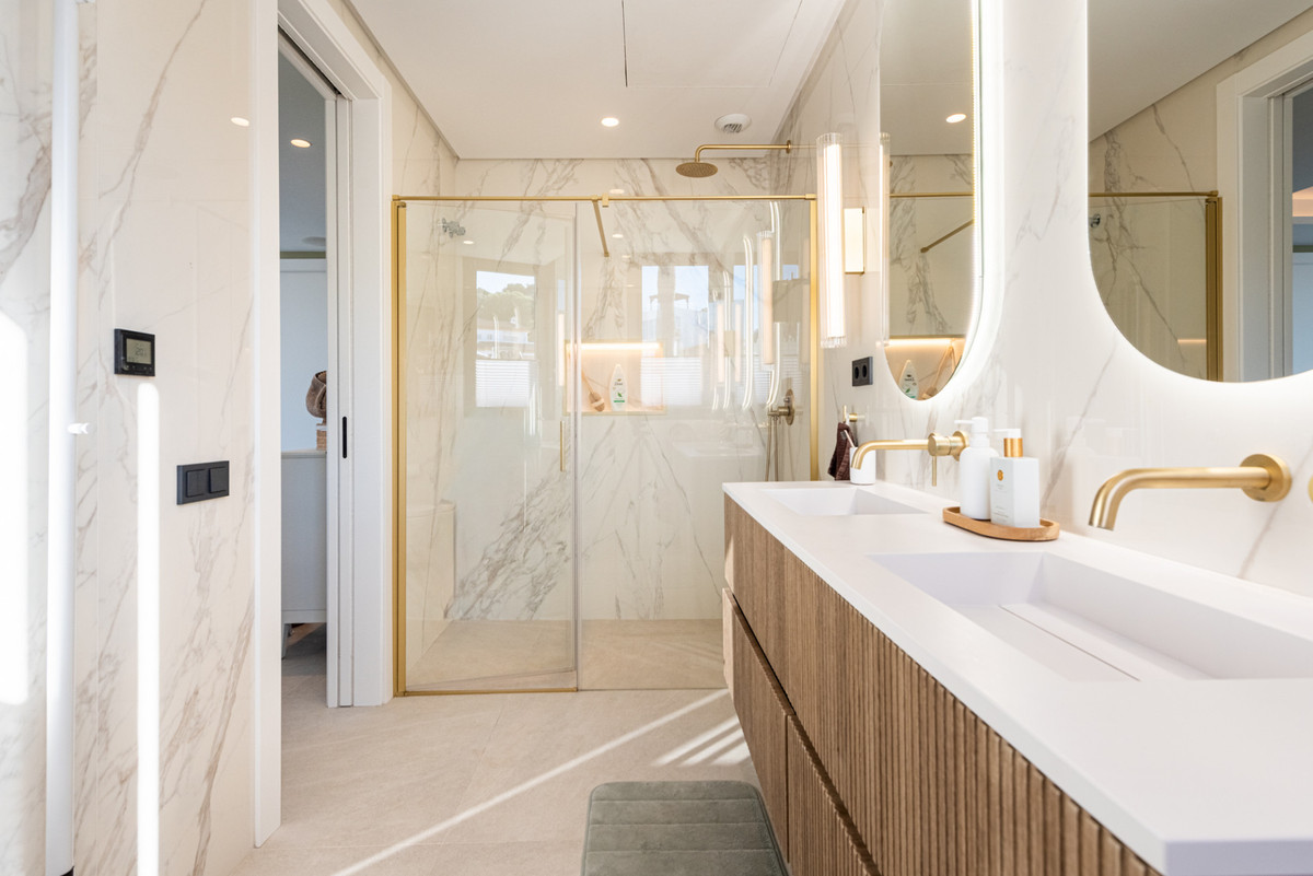 Upstairs, you'll find two expansive bedroom suites, each with its own en-suite bathroom and direct access to a large terrace offering breathtaking views. A separate south-facing terrace leads to a spiral staircase taking you up to the impressive roof terrace.