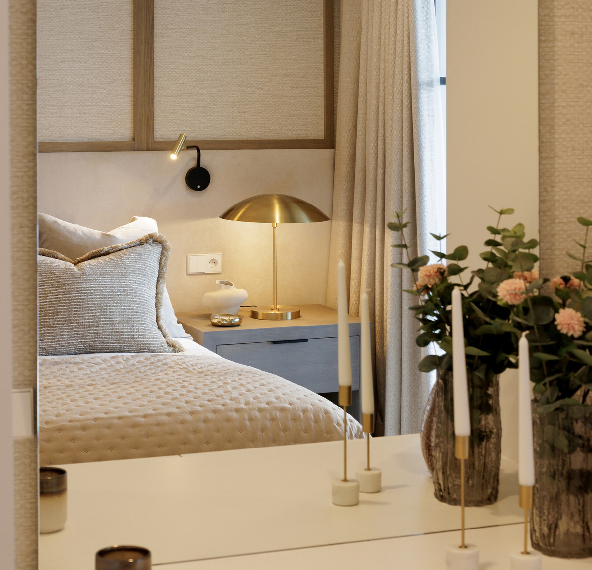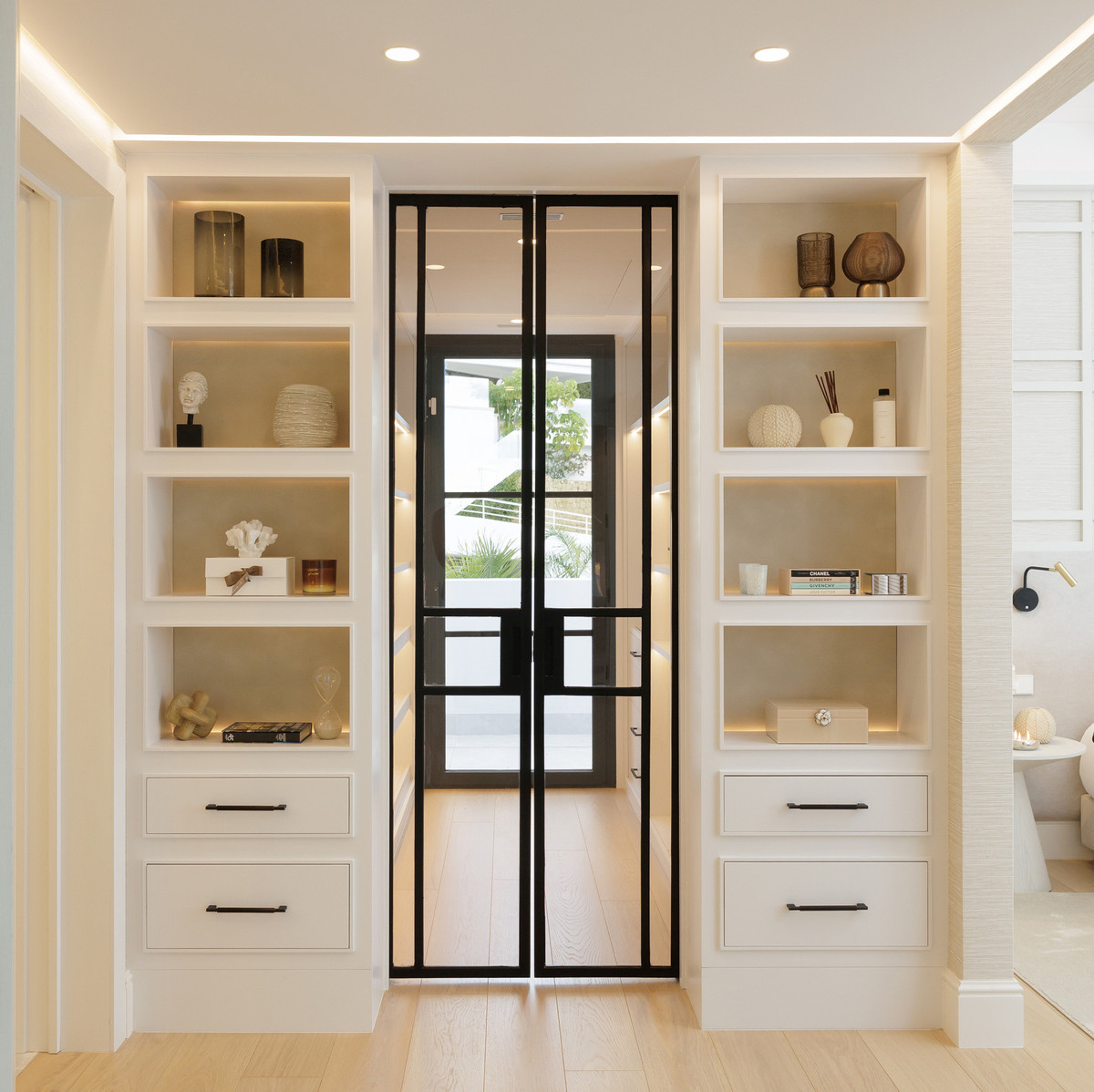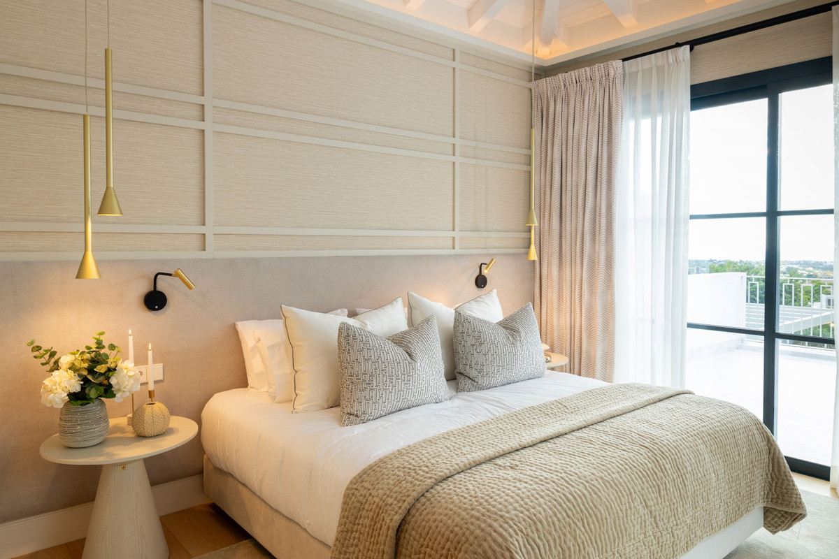 The property offers five well-appointed bedrooms, including a private primary suite on the upper floor with direct terrace access. Each room follows the same design standard—neutral tones, bespoke carpentry, and thoughtful lighting. The upper level also opens to extensive outdoor areas that capture views across the coastline.