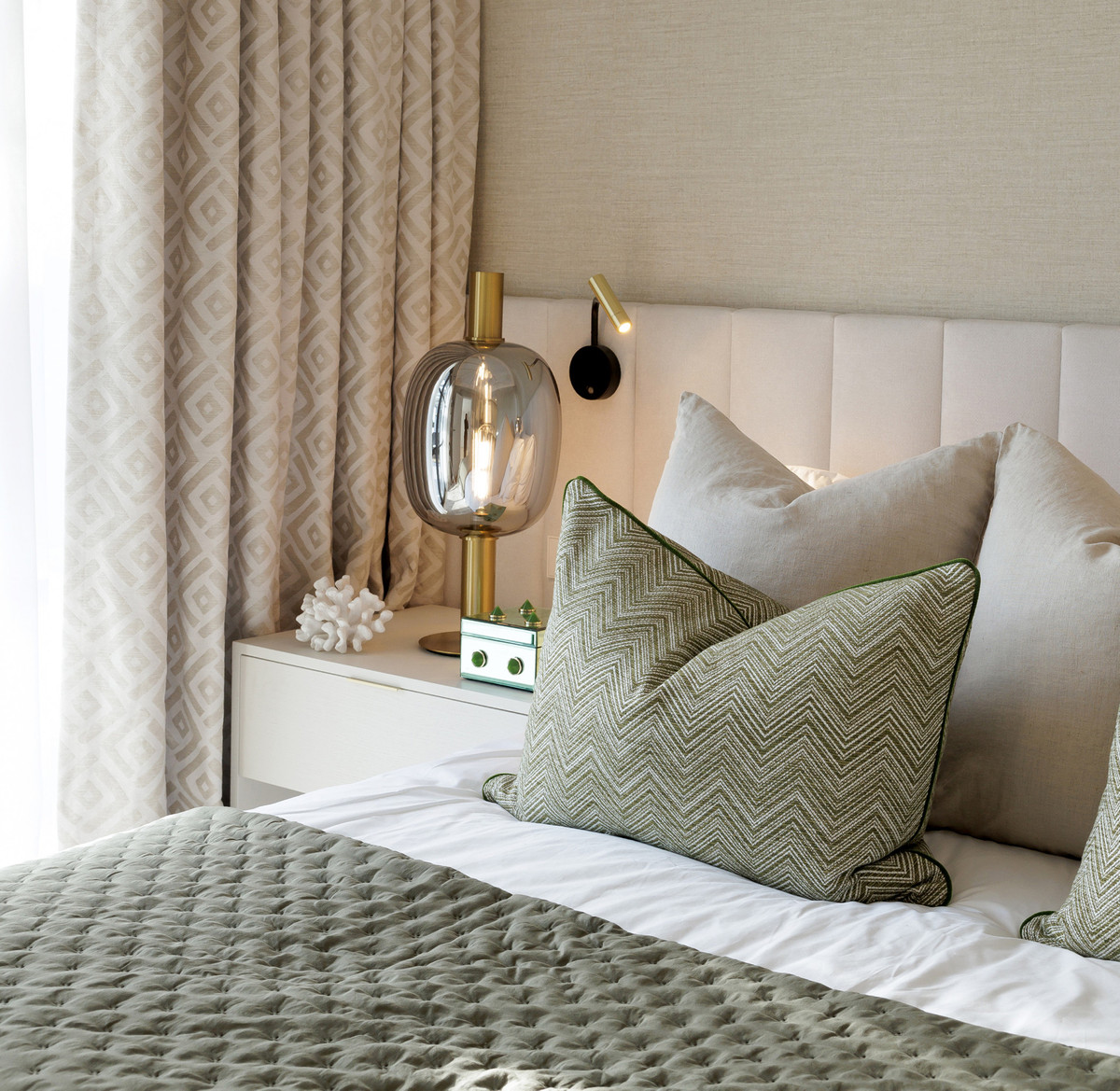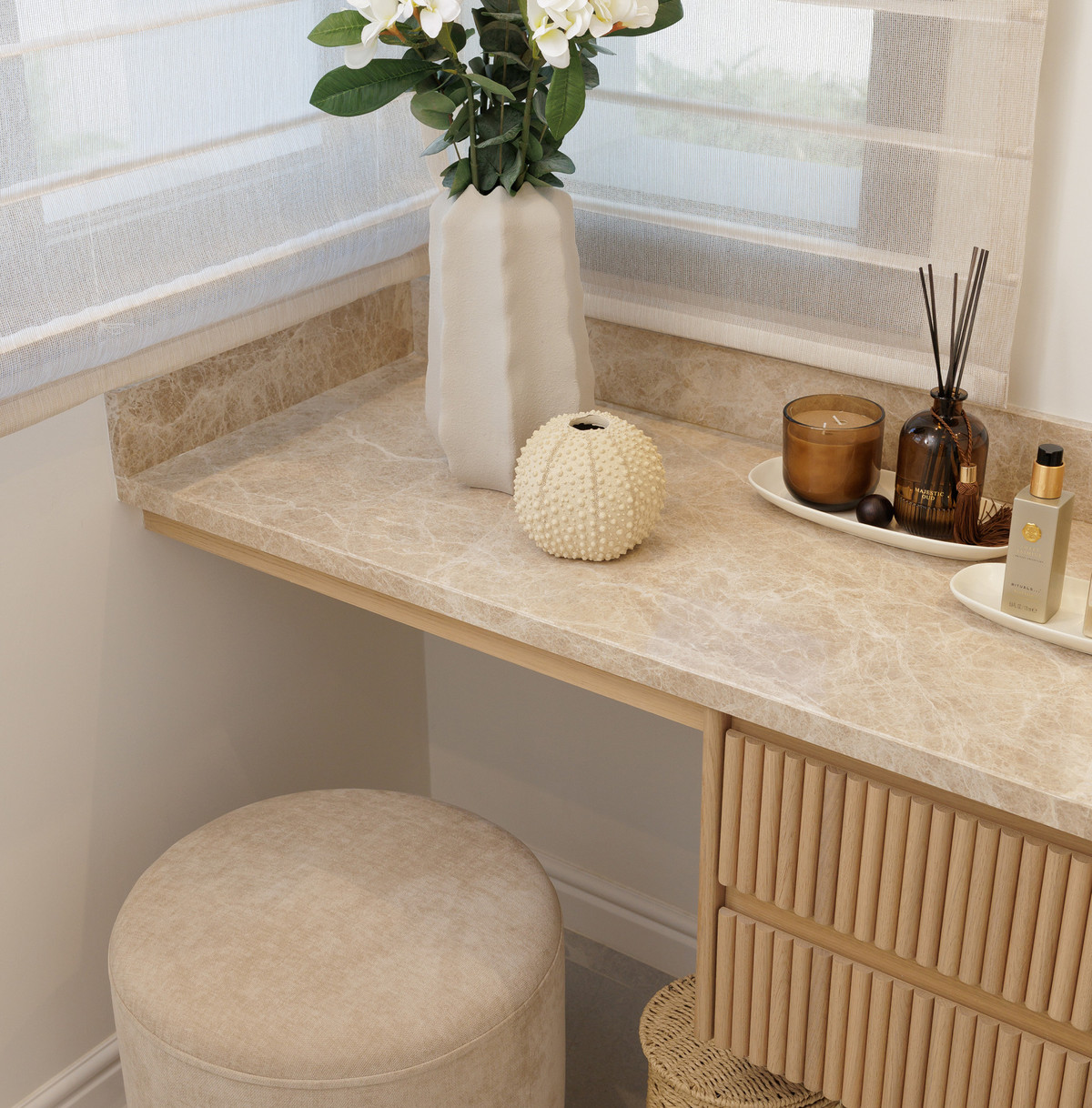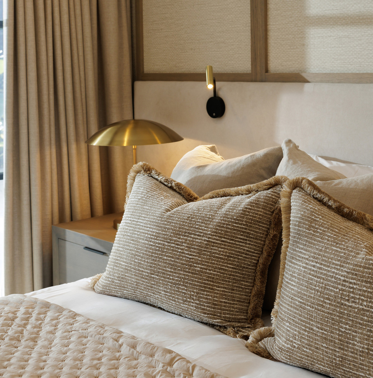 The property offers five well-appointed bedrooms, including a private primary suite on the upper floor with direct terrace access. Each room follows the same design standard—neutral tones, bespoke carpentry, and thoughtful lighting. The upper level also opens to extensive outdoor areas that capture views across the coastline.