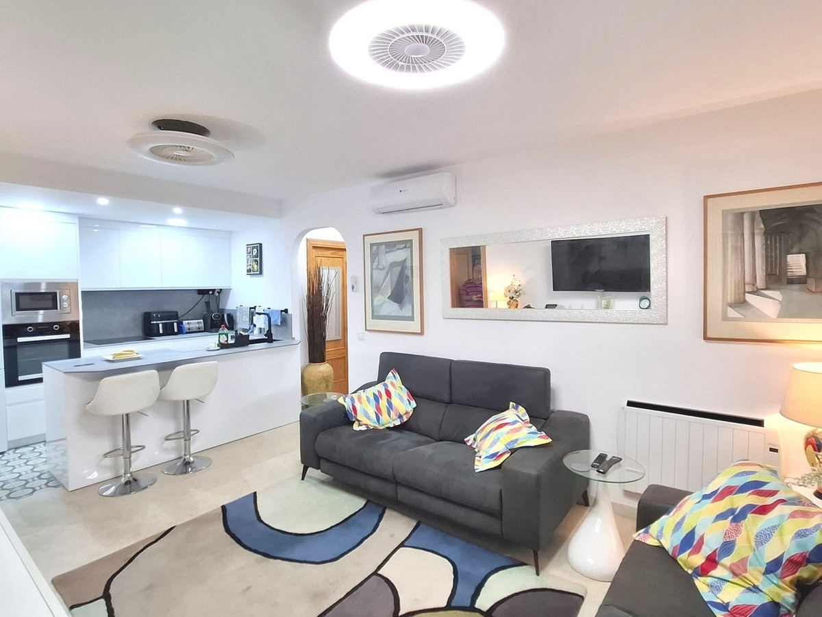 The bright and inviting lounge is filled with natural light thanks to double glass doors that open directly onto the terrace. An open plan kitchen and dining area with a breakfast bar creates a generous and airy living space. The modern kitchen includes appliances, ample worktop surfaces and plenty of storage.