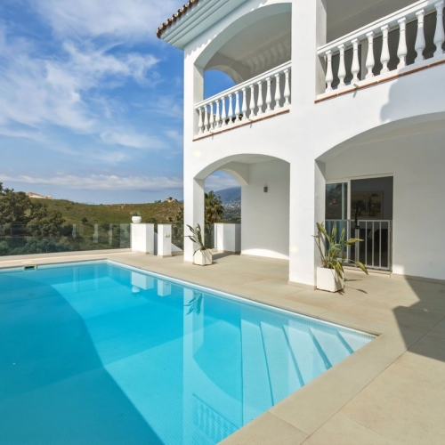 Kun 1 km fra den charmerende landsby Mijas ligger denne imponerende villa i et veletableret og meget roligt boligområde. Ejendommen er placeret for enden af en blind vej med egen privat indkørsel, hvilket giver fuldstændig fred, privatliv og en dejlig udsigt over havet og bjergene.