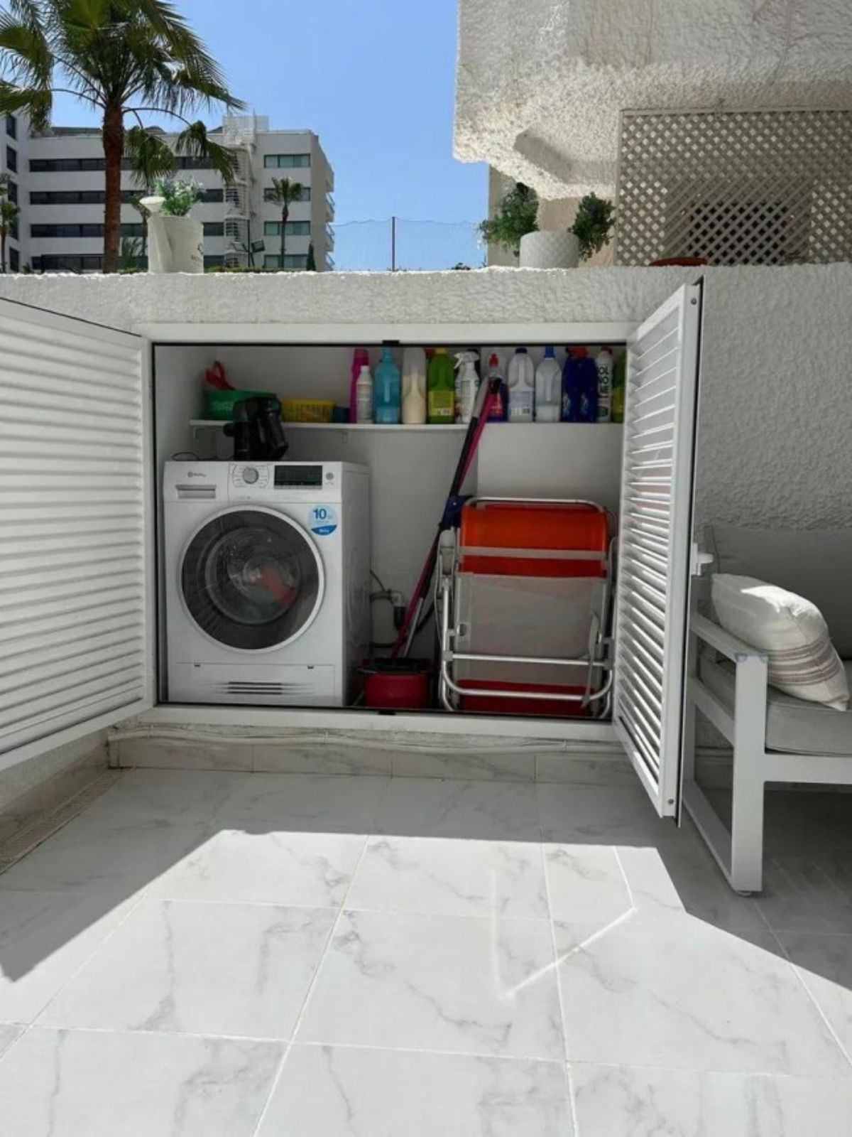 Renoveret lejlighed til salg. Et soveværelse, et HELT NYT badeværelse, åbent køkken med masser af opbevaringsplads, to indbyggede skabe, aircondition med kold/varm luft og elektroniske radiatorer. Glatte vægge. Indirekte lys med justerbar intensitet og forsænket belysning langs loftet for at skabe atmosfære. Meget lys. Skjulte designstikkontakter. På terrassen er der bygget et rum til vaskemaskine og opbevaring. Der er vaske-tørremaskine. Elektrisk markise. Lejligheden er 58 m² og terrassen er 30 m². Helt ny varmtvandsbeholder. Vand betales ikke, det er inkluderet i fællesudgifterne. Mulighed for at lave et ekstra soveværelse, da boligen er stor. Roligt boligområde designet af arkitekten Fernando Higueras, med en tropisk have, med to swimmingpools, springvand, kunstig flod med fisk, frøer, ænder… DIREKTE GANGADGANG TIL STRANDEN, uden at skulle krydse vejen, to brusere til at skylle sandet af, når du kommer tilbage fra stranden, med direkte adgang til poolen fra stranden.