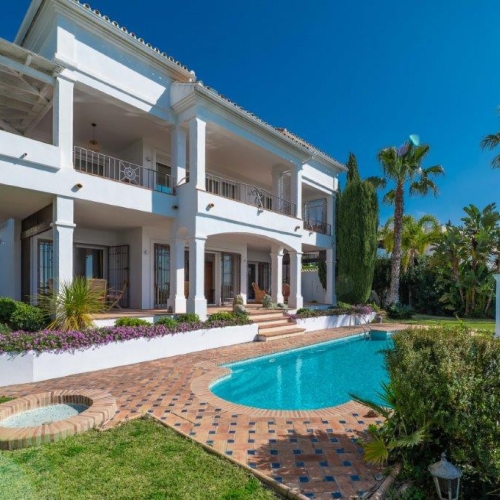 This extraordinary detached villa in Río Real, Marbella, offers a rare blend of classic Andalusian elegance and exceptional potential for modern transformation. Set atop a private hill, it enjoys uninterrupted views of the Mediterranean Sea, lush golf courses, and rolling green valleys—creating a serene yet captivating backdrop. With a vast plot of 5,775 m² and 2,600 m² of built space, the estate presents an outstanding lifestyle opportunity for discerning buyers seeking privacy, luxury, and architectural versatility.