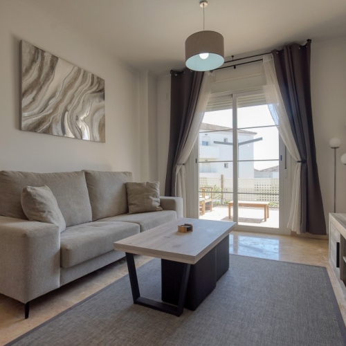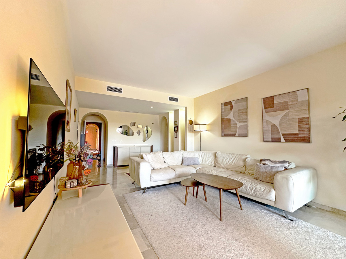 The spacious living room opens onto a Lumon glazed terrace, where you can relax and enjoy pleasant views of the pool and golf course throughout all seasons.