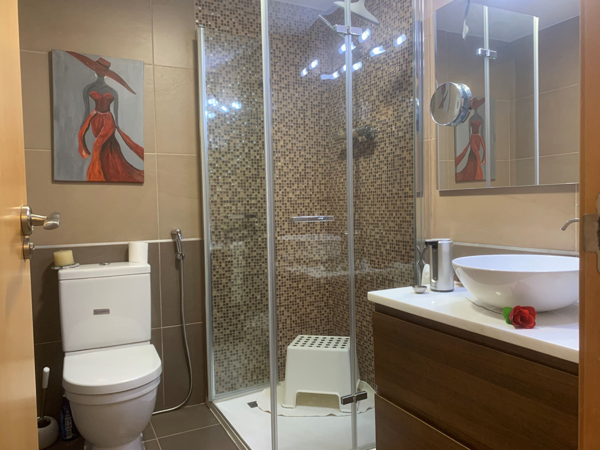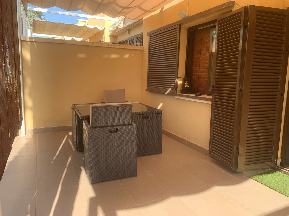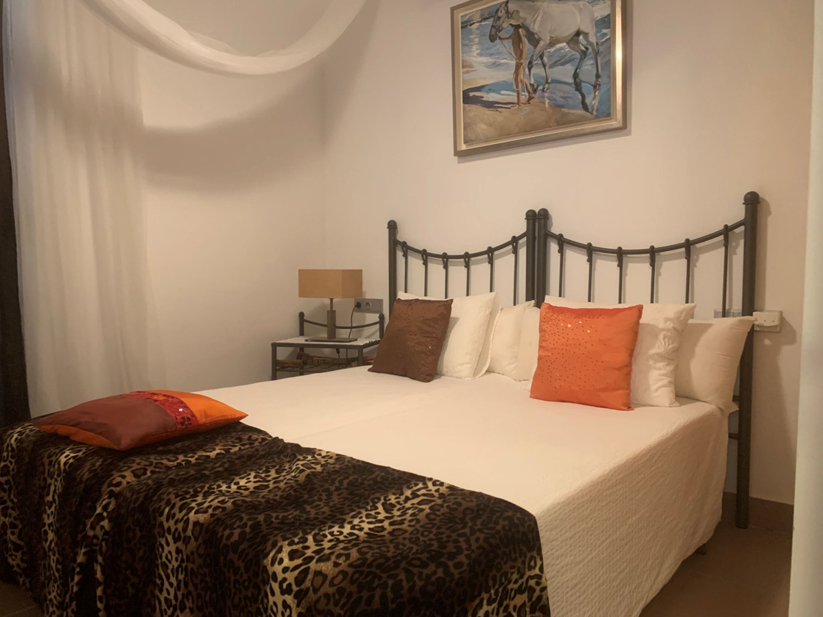 This terraced house is well planned and distributed over two floors, there are two bedrooms, two bathrooms, living room and kitchen. In addition to this, there are two patios on the ground level and a sunny terrace. In the common area there is a swimming pool. Parking options are available on the plot or on the street.