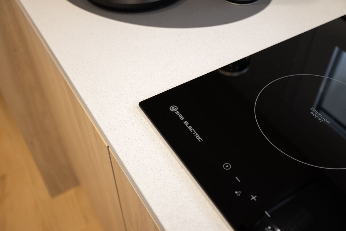 The apartment offers fine material choices throughout, lightly furnished surfaces and a lovely light flow. The living room has space for both a dining area and a lounge corner, while the kitchen is practically designed with good work surfaces and storage.