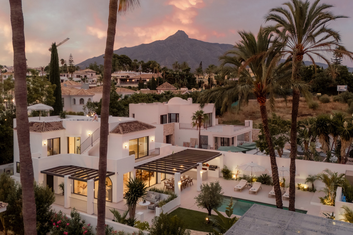 This home is a modern six bedroom luxury villa for sale in the Aloha and Las Brisas area of Marbella. The home offers 600 m² of space on an 820 m² plot with 125 m² of terraces. The villa sits minutes from Aloha Golf Los Naranjos and Las Brisas Golf Club and it offers fast access to shops restaurants and Puerto Banús which makes it ideal for buyers who want privacy and convenience.