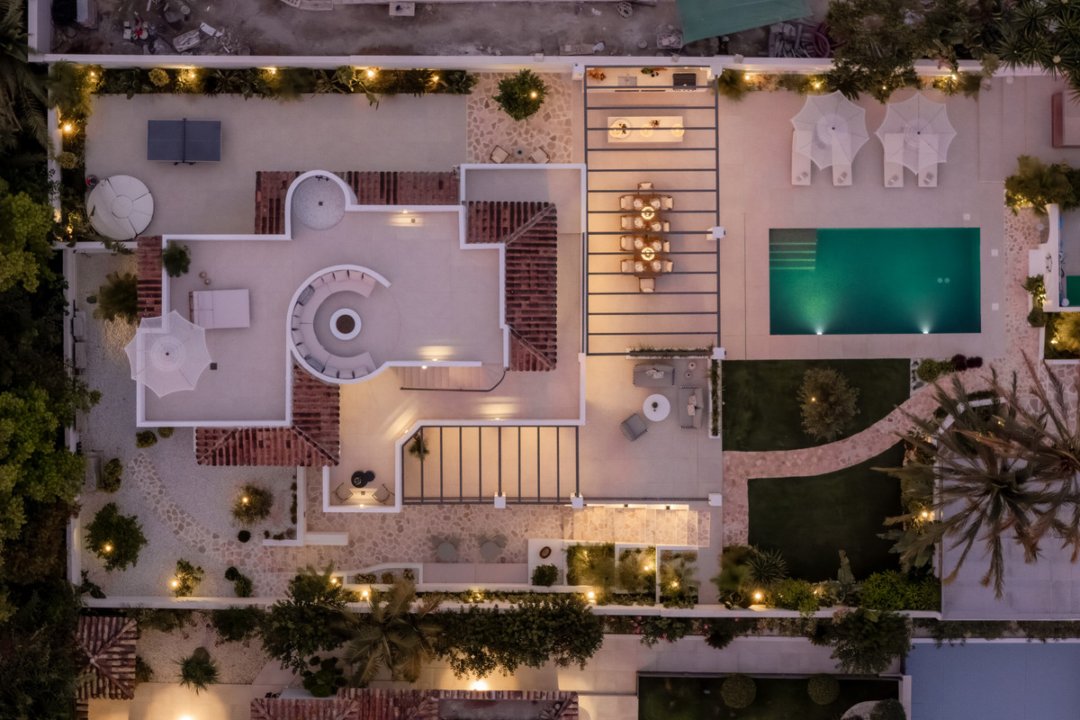 The villa includes six ensuite bedrooms and a Swedish kitchen with Miele appliances. It also offers full underfloor heating with Daikin AC and Airzone plus a private spa with a Finnish sauna a hammam and a large bathtub. A cinema room adds extra comfort and two guest toilets and two private parking spaces complete the home.