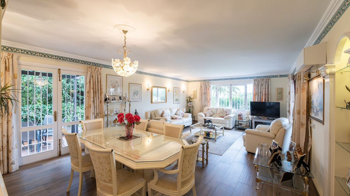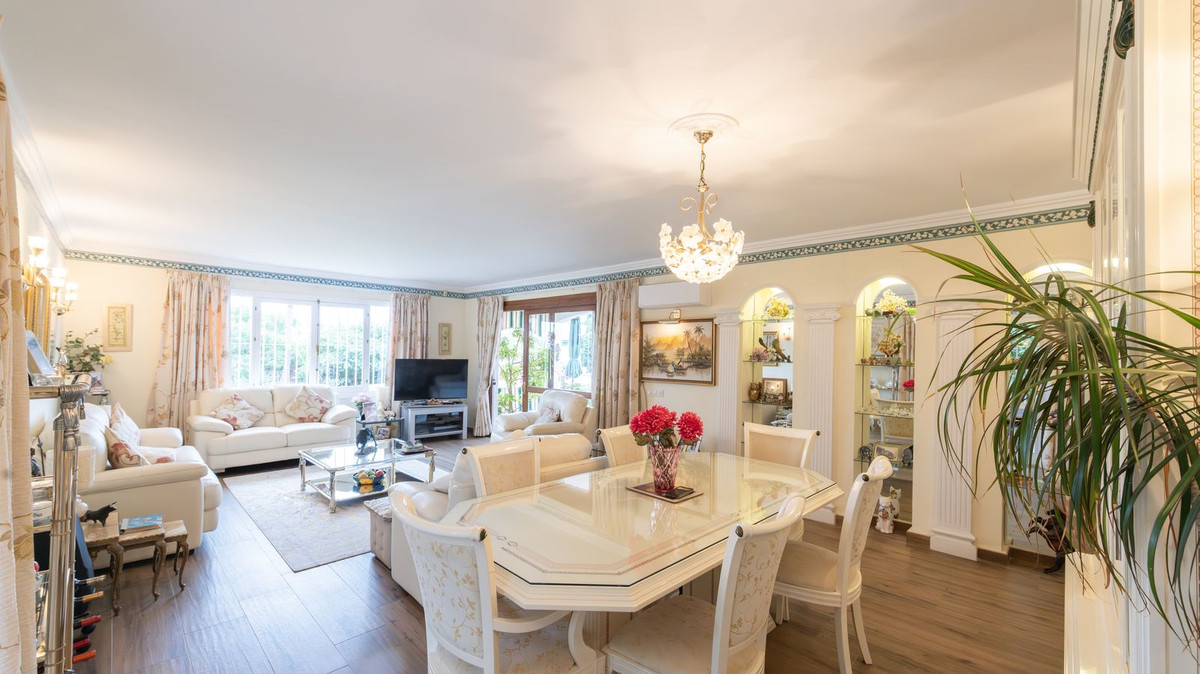 The large living-dining room, with its wide windows, opens onto a beautiful covered porch with privileged views of the garden and the pool, creating an ideal space to relax or share moments with the family.