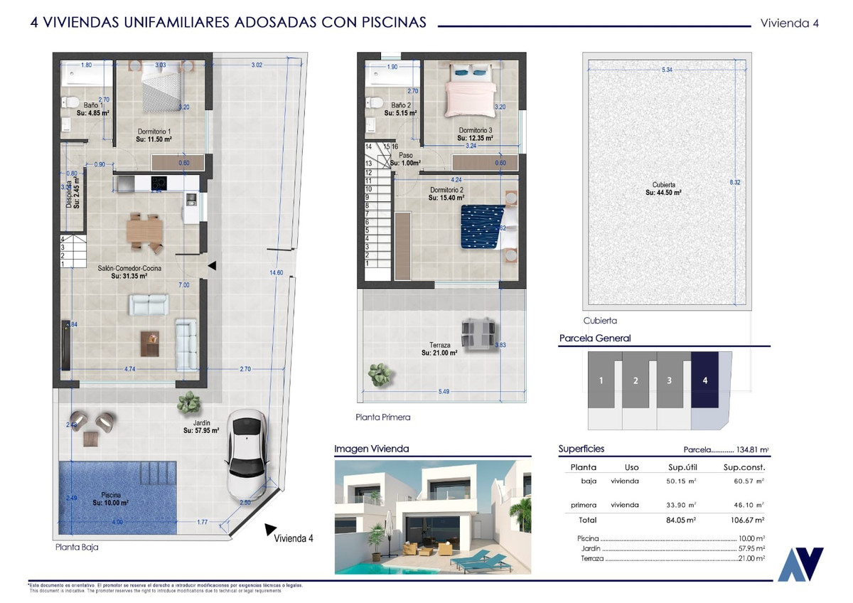 We present this contemporary semi-detached villa, built in 2024 , located in a quiet residential area in the town of San Pedro del Pinatar . The property offers 106 m² of living space on a 134 m² corner plot , ensuring greater privacy, good natural light, and optimal use of the outdoor areas.\n