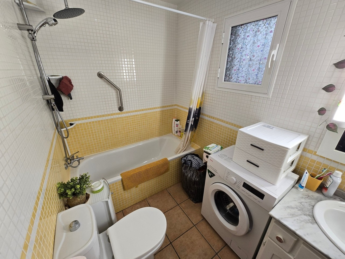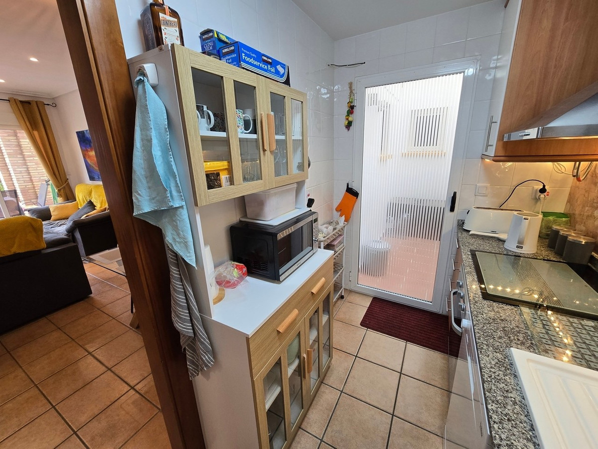 A separate, fully equipped kitchen is located just off the lounge. It features ample wall and base units, granite worktops, appliances and easy-to-maintain tiling. There is also access to a small external patio, ideal for additional storage, bicycles or garden furniture - a valuable bonus in Spain where storage space is often limited.