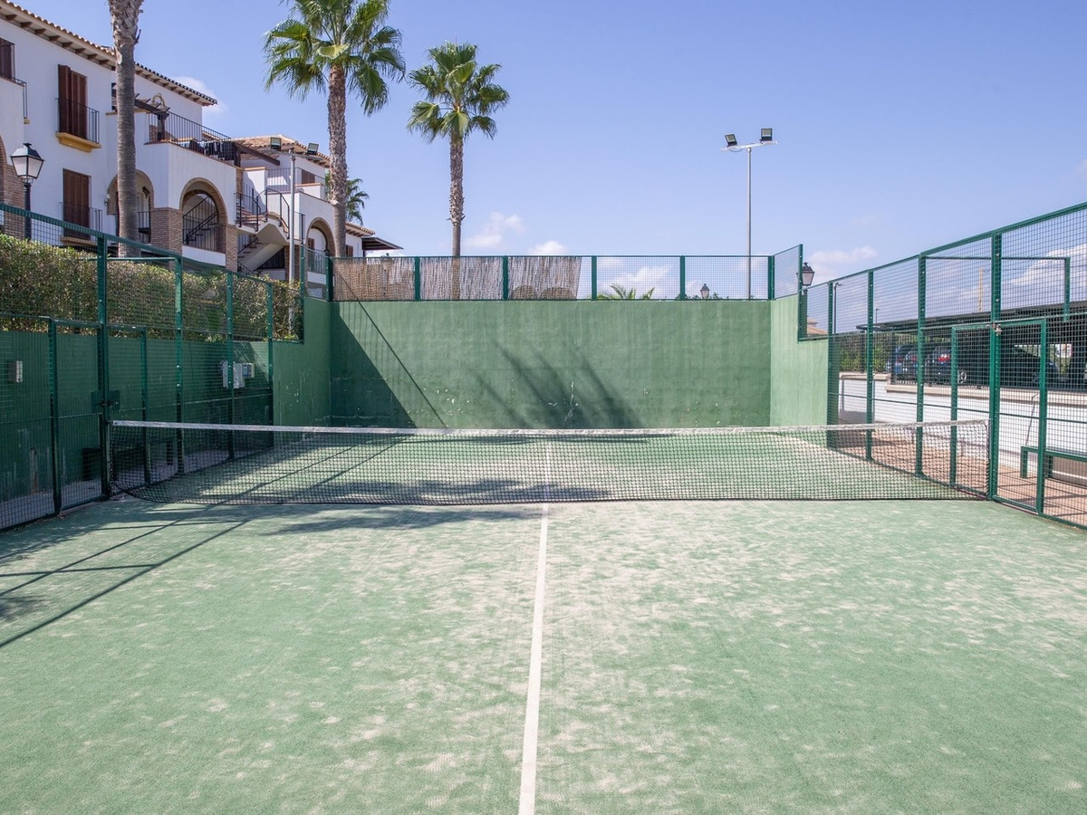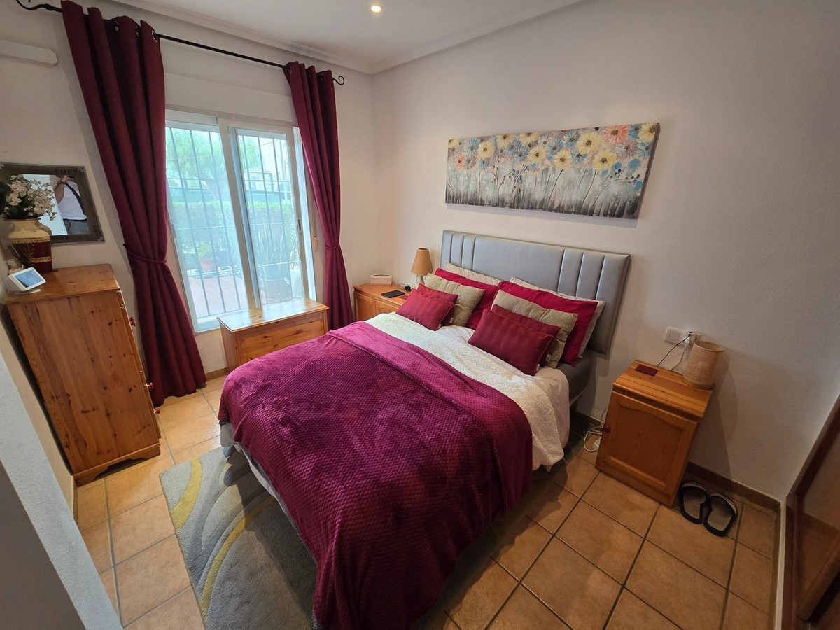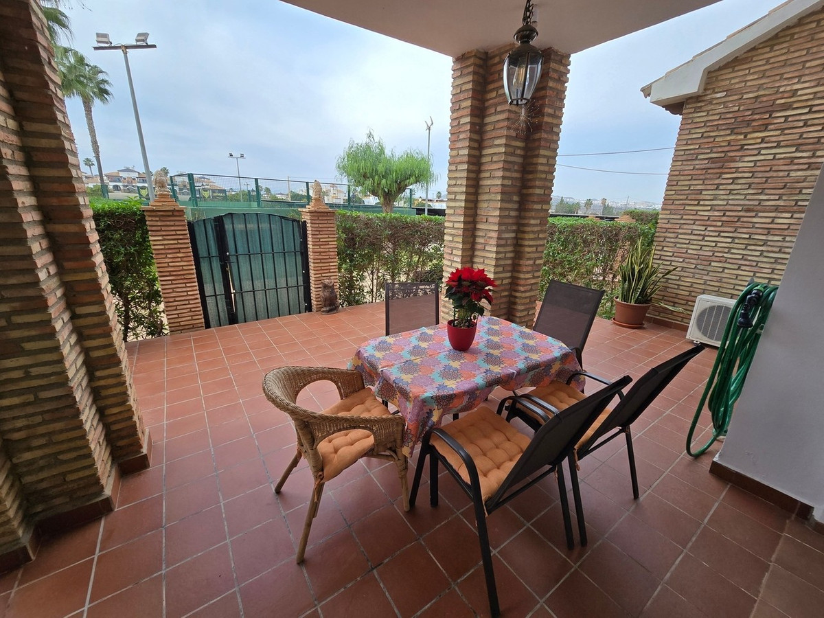 A gated access point, with just a couple of steps, leads onto a spacious private terrace bordered by a well-maintained hedge. From here, you can enjoy pleasant views across the tennis courts, the community areas and the surrounding mountains. The terrace is generously sized, making it perfect for outdoor dining, sunbathing or simply relaxing in the warm climate throughout the year.