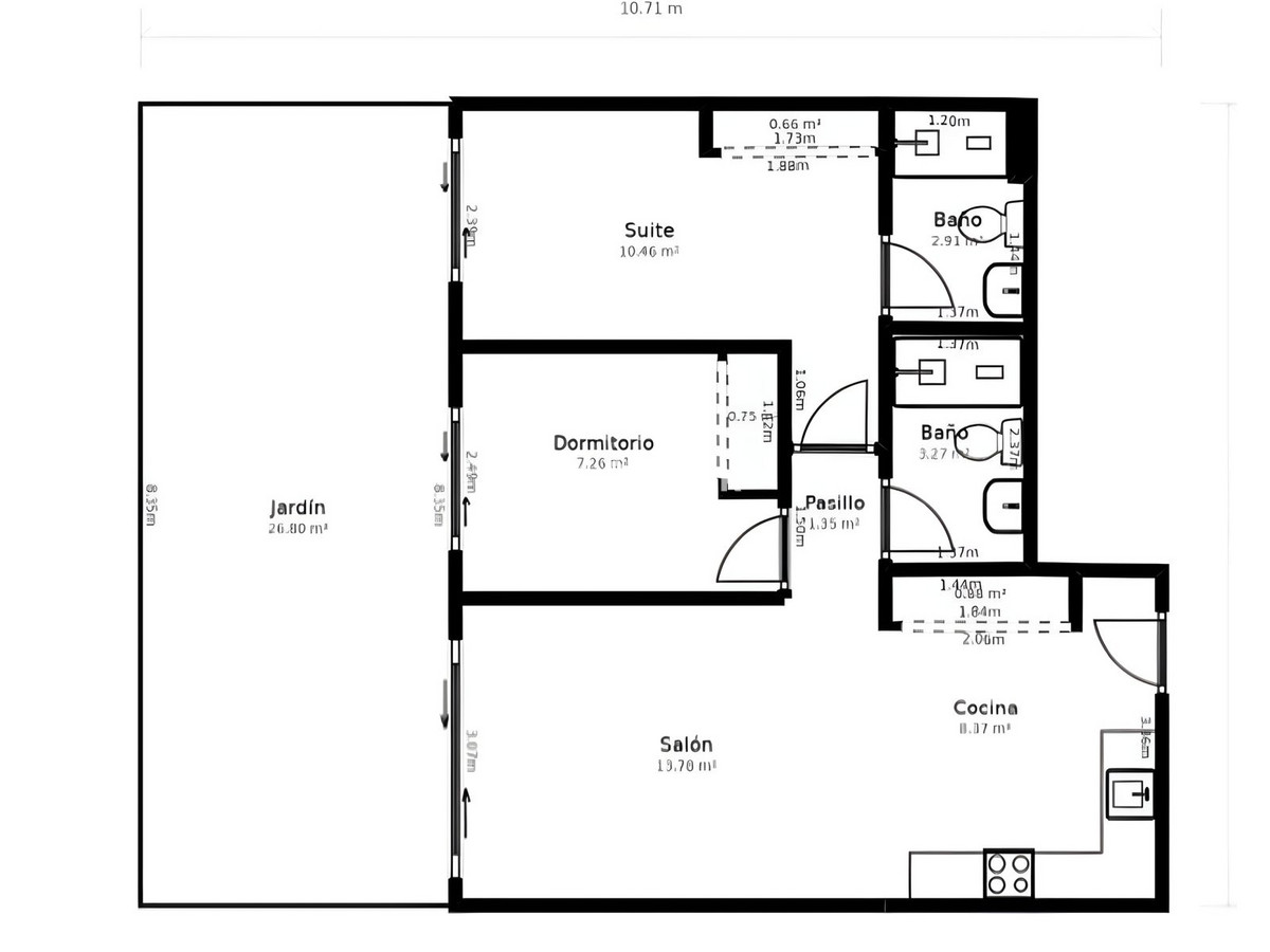 Lejligheden består af to rummelige soveværelser, herunder et master bedroom med direkte adgang til eget badeværelse. Derudover findes endnu et moderne badeværelse i stilrent design. Store vinduer sikrer masser af naturligt lys, og alle rum har direkte adgang til den store terrasse.