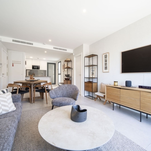 Main bedroom with ensuite bathroom and walk-in closet. This apartment is distinguished by the ingenious movable wall that connects the master bedroom-suite to the living room. This elongated sliding door is designed to duplicate the entrance of natural light and enjoying much better views. This easy interaction between the living spaces creates a flexible open area that is designed for you to enjoy the climate and lifestyle of Southern Spain. This clever design not only maximises the natural light of the Costa del Sol in both rooms, but also allows you to admire the splendid views from every corner of your home. Air conditioning hot and cold, video intercom, domotic system, pre-installation alarm system, water filter system, under floor heating in both bedrooms and bathrooms. Includes two parking spaces (one with electric car charger) and one storage room.