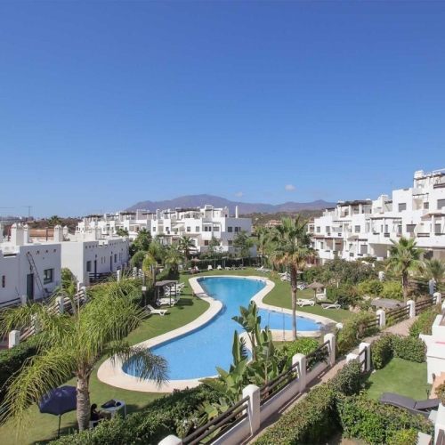 This elegant 2-bedroom, 2-bathroom apartment is located on the first floor of a modern residential complex in La Resina Golf, Estepona. The property features a spacious 31 m² terrace with beautiful open views over the tropical landscaped inner garden, creating a calm and relaxing atmosphere.