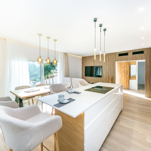 The house features air conditioning throughout and an open-plan layout between the kitchen and living room, creating a bright and airy atmosphere. Outdoors, there are multiple social areas for enjoying the pool and terrace, and parking for up to six cars. From certain areas of the house, you can even catch glimpses of the sea.