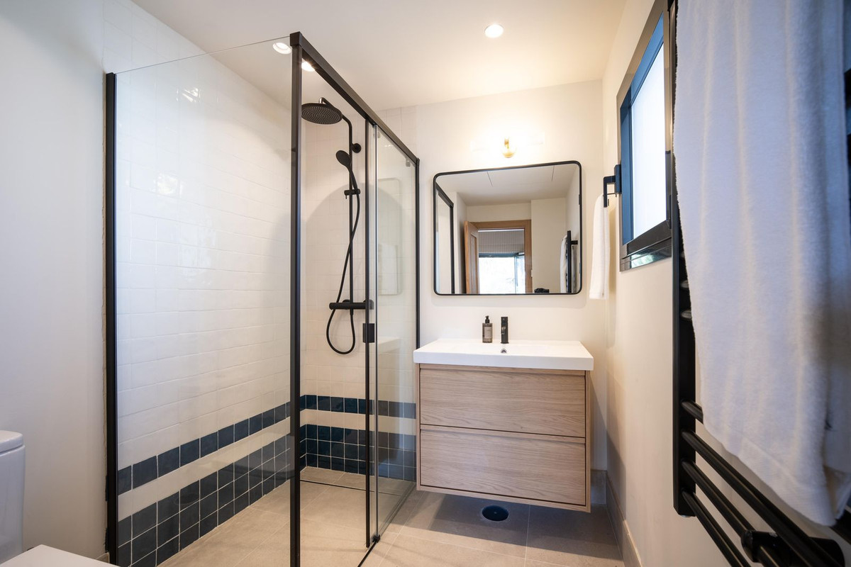 The upper level features two generous bedrooms, each with access to its own private terrace. On the lower level, an additional room serves perfectly as a home cinema, guest bedroom, or multifunctional space. The property includes two stylish bathrooms and a separate guest toilet.