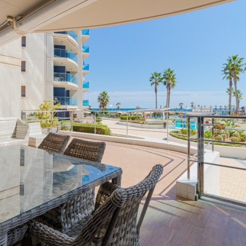 We offer you for sale this beautiful apartment situated in the best frontline community in Punta Prima - in "Sea Senses". On the first spacious terrace you can enjoy panoramic sea views and the communal areas, and from the second one surrounding beauty. Apartment consists of 2 bedrooms, 2 bathrooms, living room, fully equipped kitchen with breakfast bar and utility room.