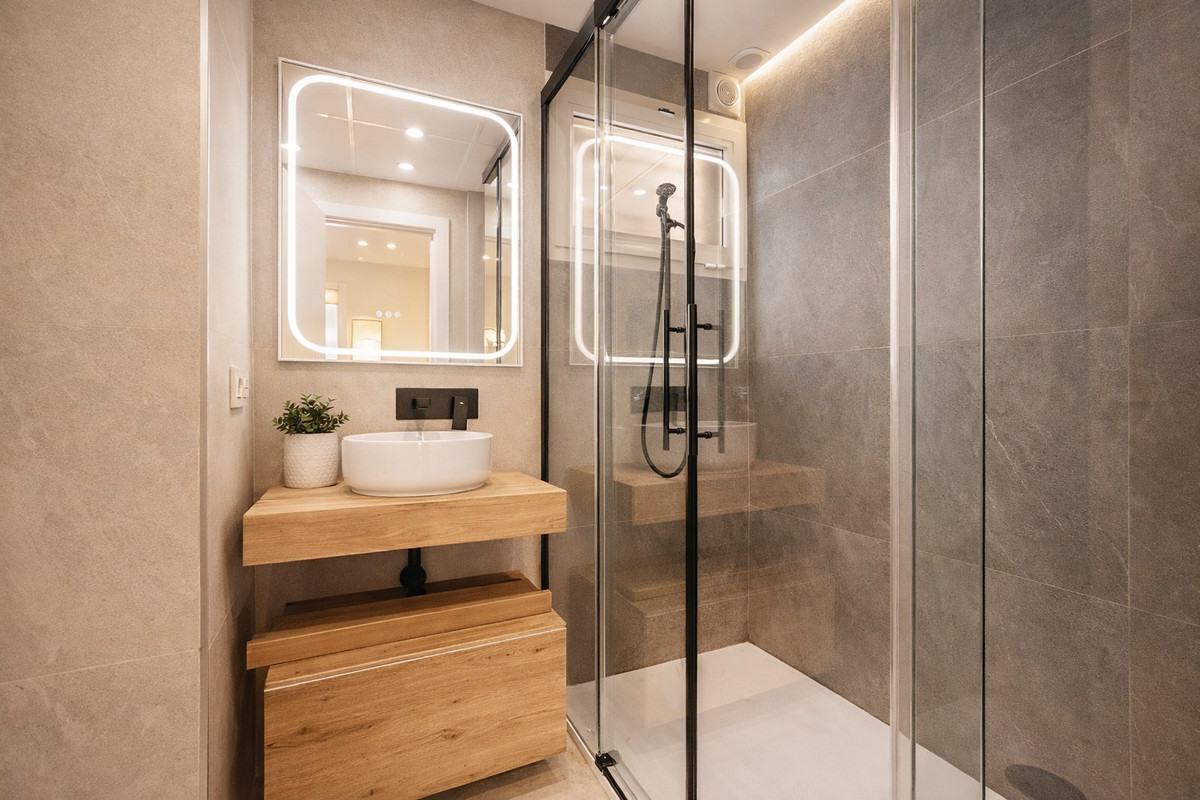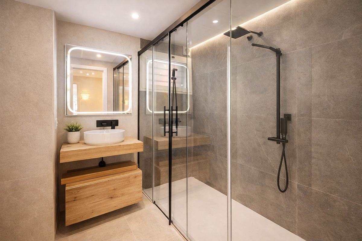 The apartment features three spacious bedrooms, all with new, lined, and illuminated built-in wardrobes, as well as ceiling fans and a powerful air conditioning system (8,000 frigories) that ensures maximum comfort throughout the year. The master bedroom has an en-suite bathroom with a modern shower and access to a balcony overlooking the interior of the complex, while the other two bedrooms—one currently used as a dressing room—share a second full bathroom. Both bathrooms stand out for their complete renovation with top-quality finishes, each featuring exterior windows that provide perfect ventilation. They include sliding glass shower screens designed to offer greater comfort and elegance.